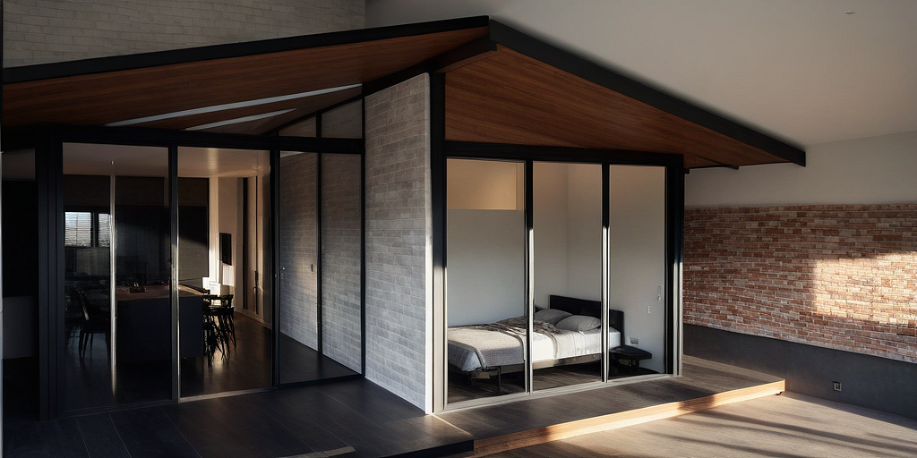 Promptbricks, black structure, windows, bedroom, kitchen, pvc white ceiling, modern, minimalist