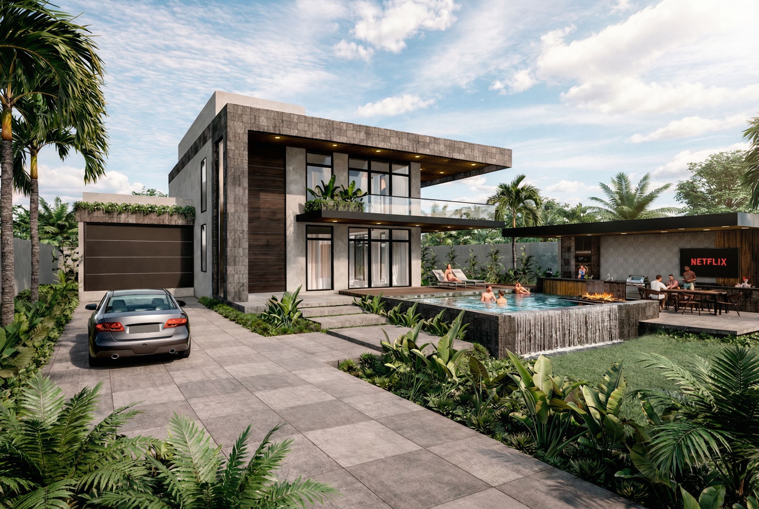 Photo of a modern residential villa showcasing a sleek design with a mix of concrete and wood textures. Emphasize the open layout, large windows, and cantilevered balcony, surrounded by tropical landscaping. The setting features a serene pool area, with a cozy outdoor dining space adjacent to it. Natural daylight casts soft shadows, illuminating the architecture. Captured from a low angle to highlight the structural features, with a wide-angle lens to encompass the lush surroundings and the inviting atmosphere.