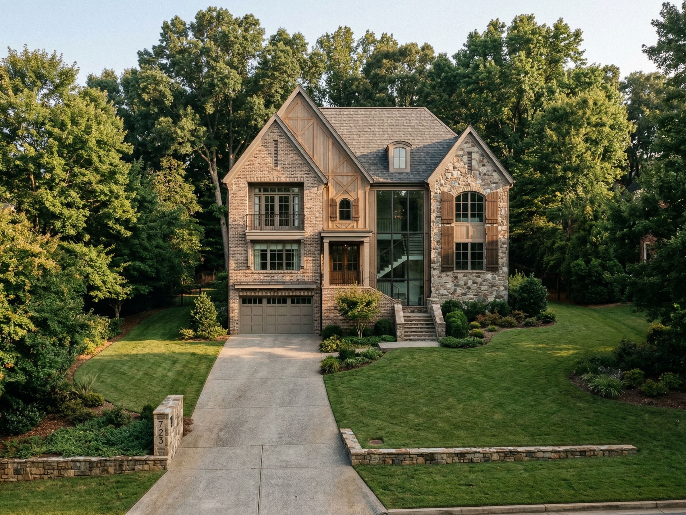 PromptPhoto of a contemporary house featuring a mix of brick and glass elements, highlighting sharp angles and multiple textures. The structure is set on a sloped lot, surrounded by lush trees that provide a natural backdrop. Soft morning light casts gentle shadows, accentuating the architectural details. Captured from a slightly elevated angle, the framing includes the driveway leading to the entrance, allowing a glimpse of the house's modern facade and unique features, rendered in lifelike quality to enhance depth and realism., keep exact camera angle