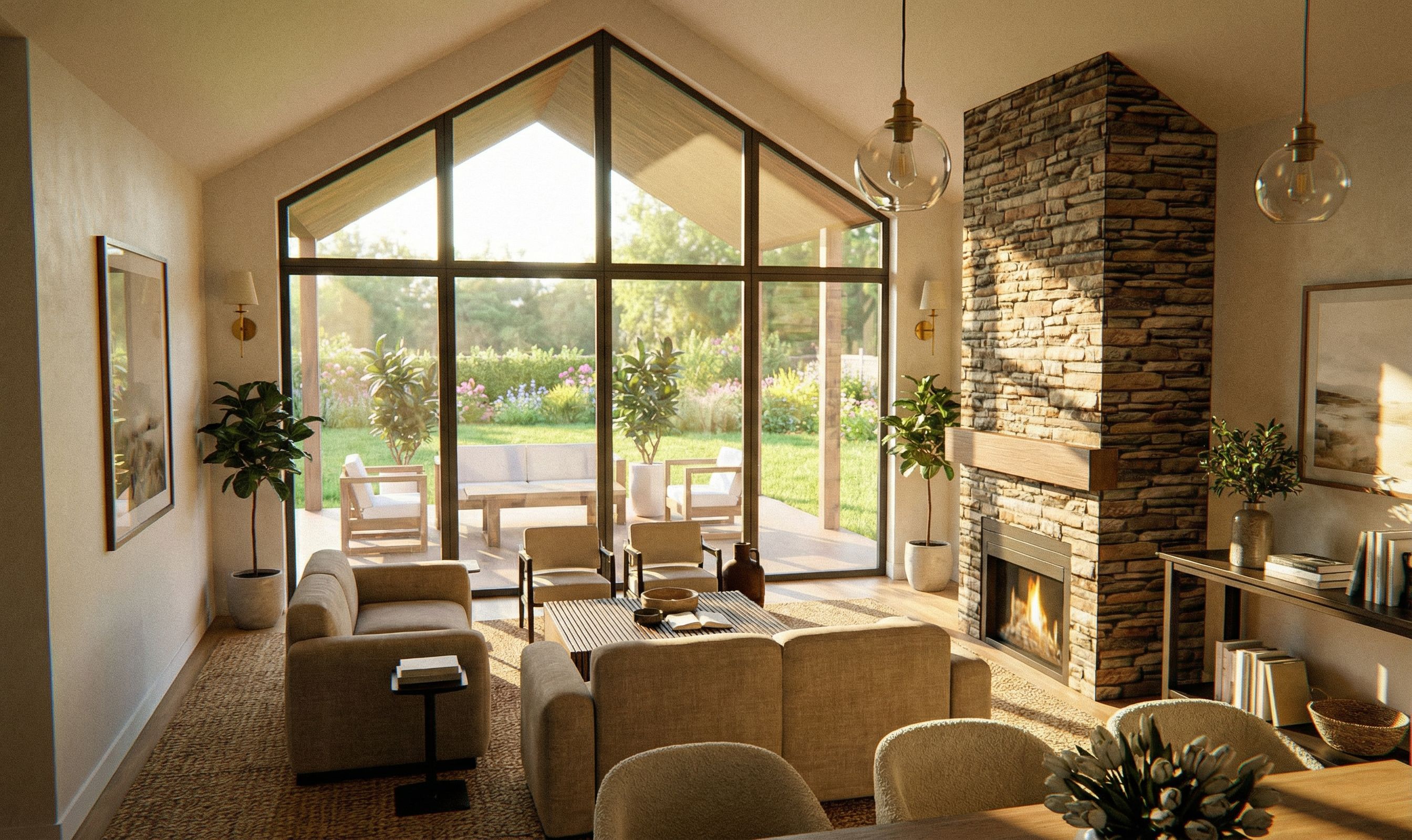 CREATE A BEAUTIFUL COZY LINEN ROOM, CHANGE THE FUREPLACE STONE TO REAL STONE, MATCH THE ART AND LIGHTS AND FURNITURE IN THE REFERENCE PHOTO, FULL SUN, WARM SUMMER VIEW OF THE GRASS BACKYARD, keep exact camera angle