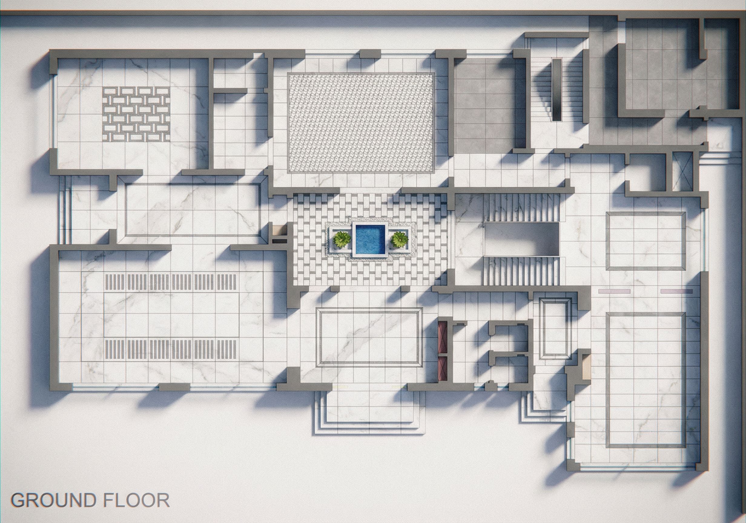 الصورة لمسقط الدور الارضي في فيلا فاخرة والأرضية مكسية بالرخام الستتواريو مع تطعيم برخام رمادي فاتح في الاحزمة الرمادية التي تتخلل الرخام وأما المناطق التي باللون الاحمر فهيمن البورسلان الرمادي والمطلوب واظهار صورة الارضية بصورة واقعية مع ظلال للجدران خفيفة ولا تضع الفرش و حافظ على تقسيمة القطع في الأرضية حسب التصميم في الصورة ولا تقم بتوزيع الرخام خارج المسقط, keep exact camera angle