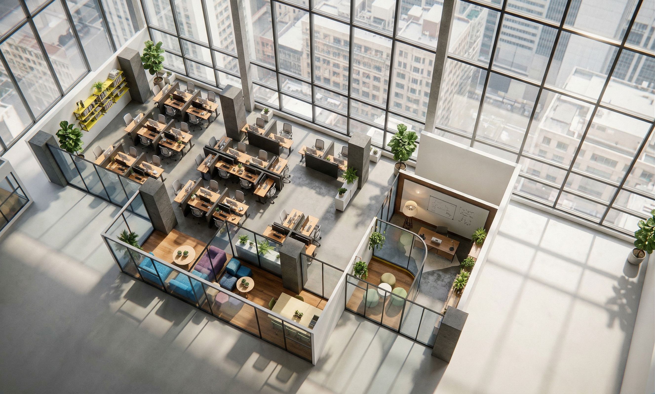 Photo of a modern office interior featuring an open-plan workspace with organized desks and ergonomic chairs. Incorporates large glass walls, allowing for natural light to flood the space, highlighting textures of wood and metal. Nearby, cozy meeting areas with soft furnishings. Captured from an elevated angle, emphasizing the layout and flow of areas, while shadows cast by structural elements add depth. Bright lighting conditions simulate a vibrant working environment, with hints of greenery integrated into the design for a touch of nature., keep exact camera angle