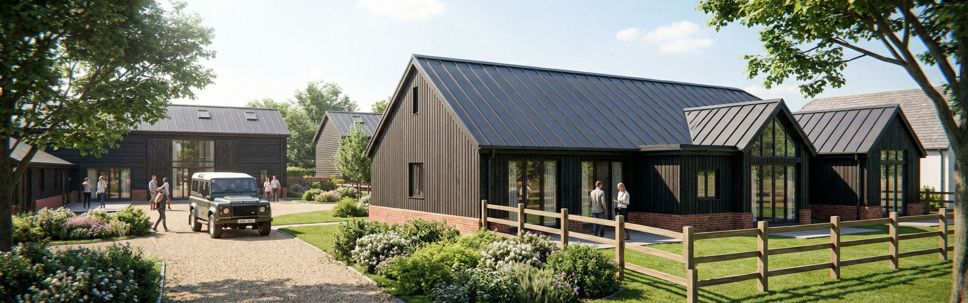 barn style, dark vertical timber cladding, red brick plinth, metal roof
