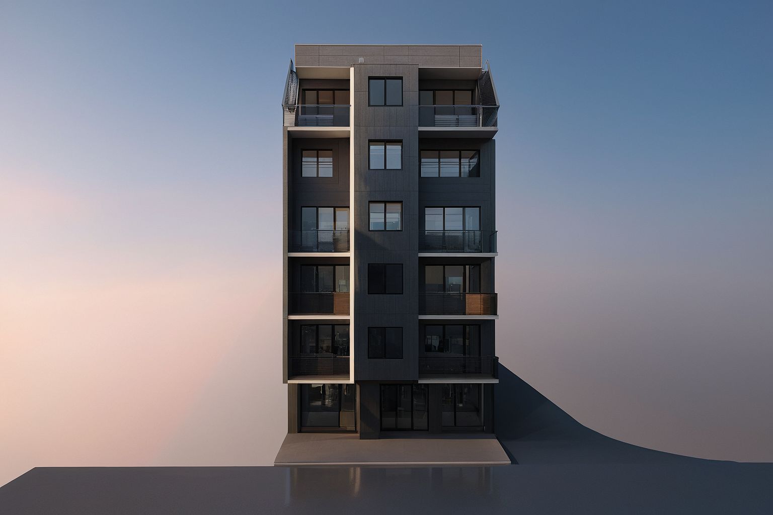 PromptPhoto of a modern residential building featuring clean lines and a minimalist façade. Emphasize white stucco exterior, large dark glass windows, and subtle balcony details. Set against a clear blue sky, enhancing the contemporary urban context. Capture natural lighting during mid-afternoon, showcasing soft shadows on the ground. Use a straight-on camera angle with a 50mm lens to highlight the symmetry and design of the structure, creating lifelike textures and reflections in the glass.