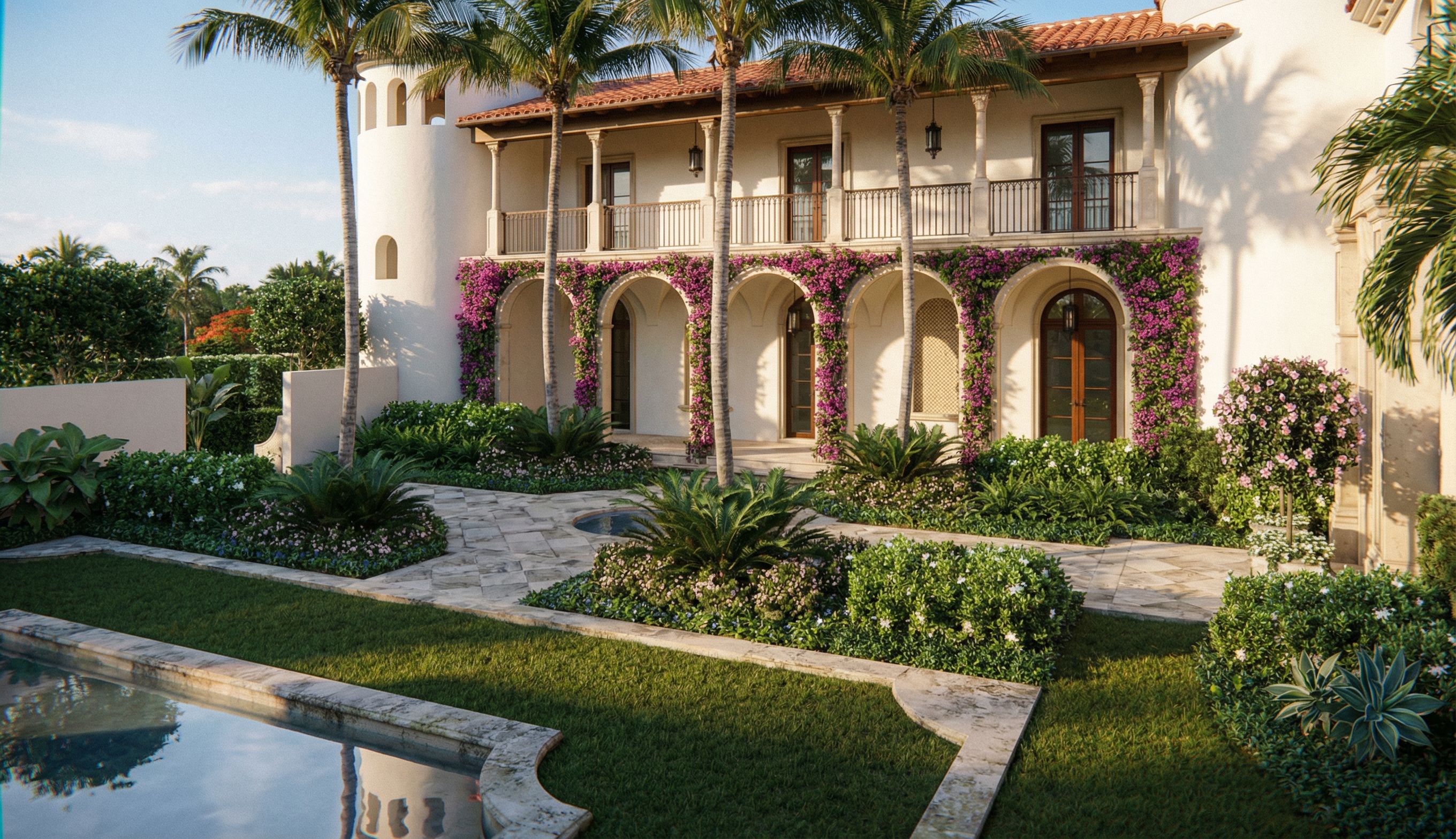 Ultra photorealistic architectural rendering of a Mediterranean Revival residence in Palm Beach, Florida using the uploaded image as the exact visual reference for both the architecture and the landscape layout. The uploaded image defines the exact building massing, architectural elements, hardscape layout, reflection pool, planting bed locations, lawn areas, palm placement, vine locations, hedge locations, and overall garden composition. Preserve all of these exactly as shown. Do not alter the architecture in any way. Do not change the massing, roof shapes, tower geometry, arches, column spacing, balcony layout, paving layout, pool shape, window placement, door placement, or any architectural detail. Do not add new windows, doors, openings, or architectural features. Do not redesign the landscape. Keep the existing landscape type, planting locations, bed layout, lawn layout, palm locations, vine placement, hedge masses, and general garden composition exactly as shown in the reference image. Only enhance the image by making the landscape feel more lush, mature, luxurious, and refined, like the landscaping of a multimillion dollar villa in Palm Beach. The architecture should remain a refined Palm Beach Mediterranean Revival estate with smooth hand troweled white stucco, terracotta barrel tile roofing, limestone at the primary surround, cast stone columns and trim, mahogany doors and windows, cypress soffits and beams, and limewashed cypress rafter tails. All materials should appear extremely realistic and high end with subtle natural variation and believable texture. The water element in the foreground is a reflection pool, not a swimming pool. Keep it as a shallow, elegant reflection pool with calm mirror-like water and soft architectural reflections. The landscape enhancement should respect the existing design language shown in the image. Maintain the same formal Palm Beach Mediterranean garden character, but make it feel richer, fuller, and more luxurious. Keep the existing palms in their current locations, but make them feel more elegant, mature, and realistic with fuller canopies and natural variation. Keep the bougainvillea in the same locations on the loggia and walls, but make it more beautiful, abundant, and integrated, with lush blooming growth that still reveals the arches and architecture clearly. Do not let the vines completely cover or obscure the columns, arches, or façade. Keep the hedge masses and low planting layout where they currently are, but refine them into more layered, upscale garden beds with richer texture, more depth, and subtle variation in height. Enhance the existing planting with a sophisticated Palm Beach luxury garden palette: manicured hedges, layered tropical foliage, elegant flowering shrubs, restrained groundcover, sculptural cycads, and refined accents of color. The composition should feel curated by a high end landscape architect. The planting should look fuller and more established, with better layering, more depth, and more visual richness, but still controlled and elegant. Avoid anything wild, overgrown, messy, or too dense. Avoid a resort or jungle look. This should feel like a historic Palm Beach estate garden. Keep the hardscape layout exactly as shown. Keep the same paving geometry and circulation, but make the materials more photorealistic with subtle natural stone variation and a handcrafted feel. Lighting should feel like luxury architectural real estate photography in Palm Beach, with warm late afternoon sunlight, soft atmospheric haze, subtle Florida humidity, realistic shadows, and balanced exposure. The final image should look like a real photograph of a multimillion dollar Palm Beach Mediterranean Revival villa with professionally designed luxury landscaping. Ultra photorealistic, elegant, lush, mature, refined, natural, and believable. Do not change architecture. Do not change massing. Do not change hardscape layout. Do not change pool shape. Do not change planting bed locations. Do not change lawn areas. Do not change palm locations. Do not change vine locations. Only make the existing landscape richer, more mature, more layered, and more luxurious., keep exact camera angle