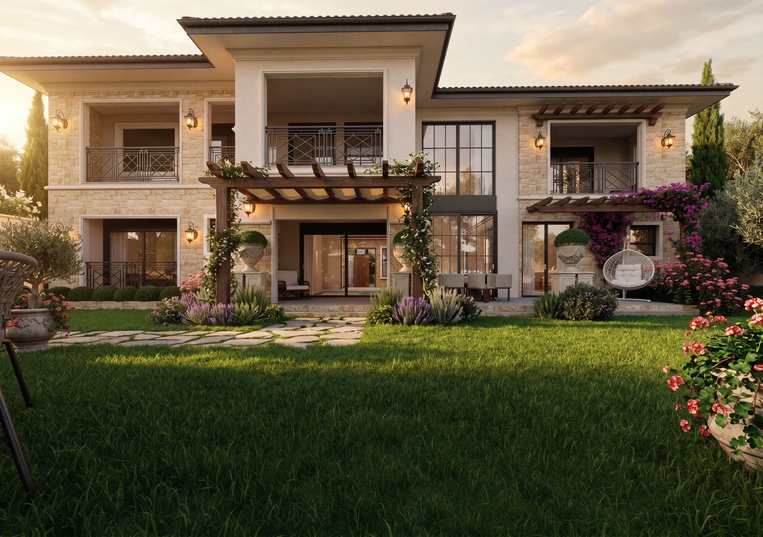 Render a neoclassical villa eith meditterenean theme. Warm ligting- add some pergolas and timber, keep exact camera angle