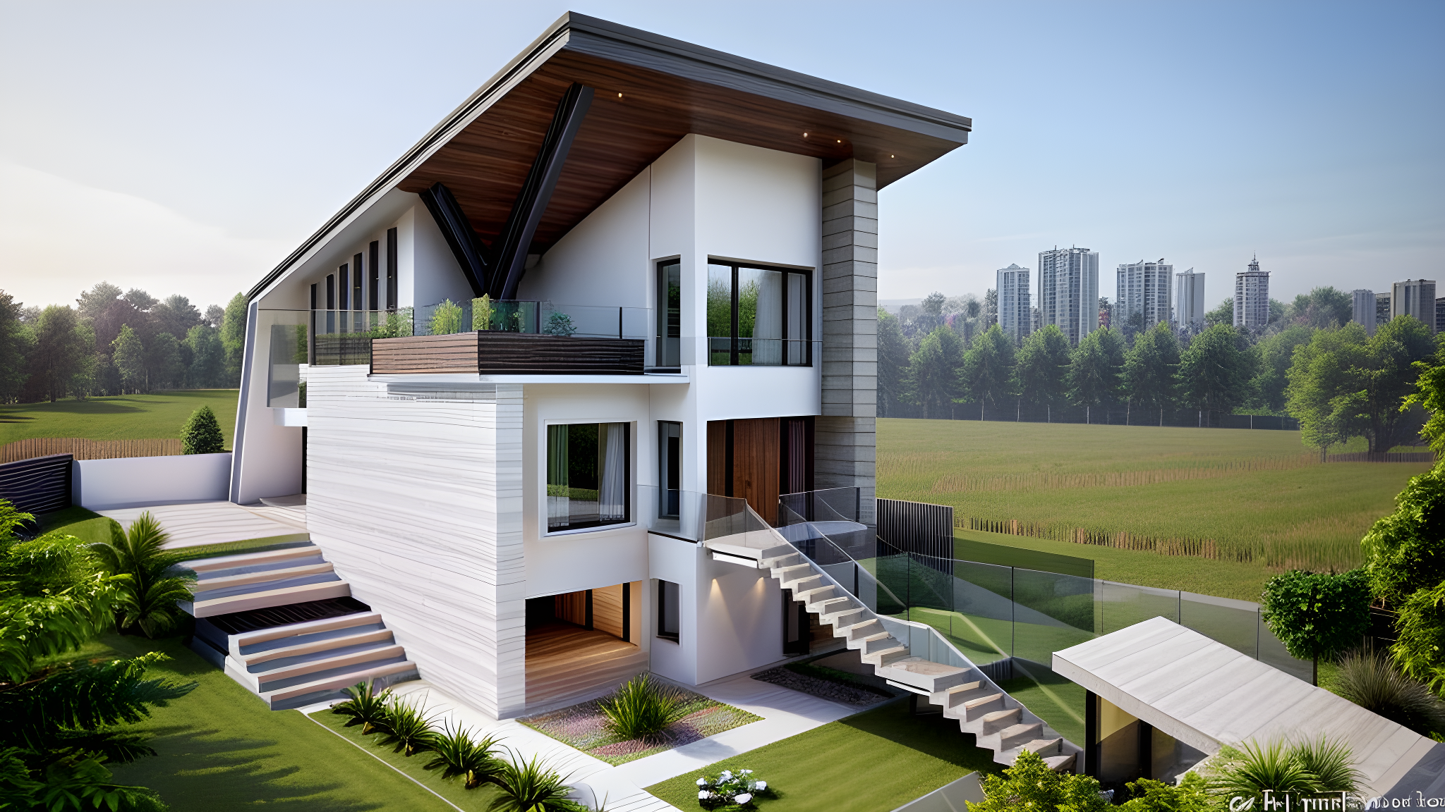 Promptmodern house in Romania, clean and simple facade, dark wood on the facade, glass and white plaster, vegetation in the back of the house, natural background, stair to the yard