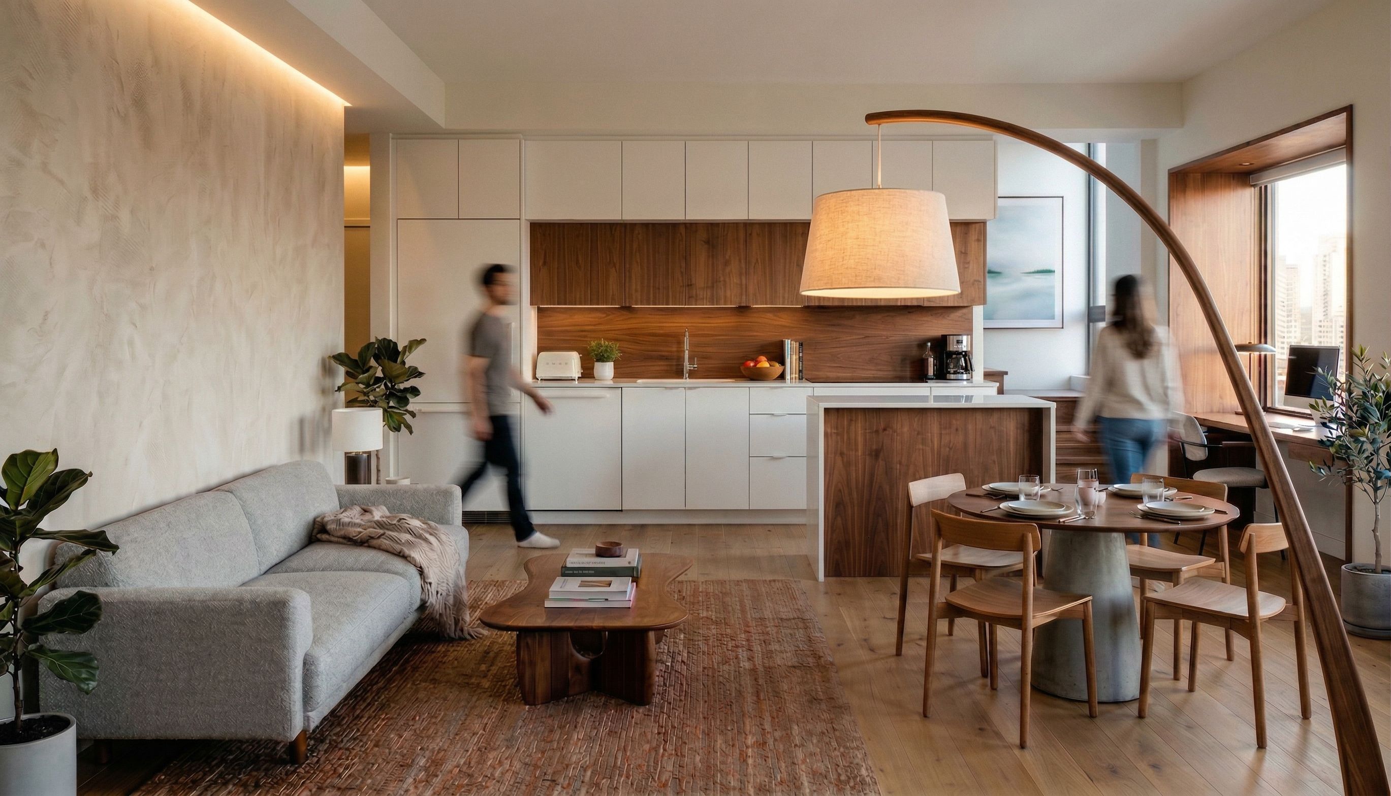 Promptadd LED light strip above sofa and insert Gibson wood hanging arc floor lamp in front of sofa