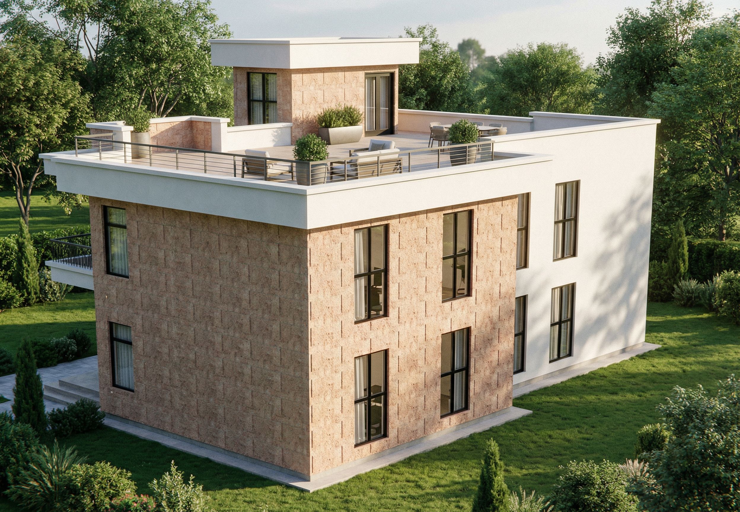 PromptPhoto of a contemporary residential building featuring a mix of smooth white stucco and textured coral stone cladding. Highlight architectural details such as large black-framed windows and a panoramic terrace, integrated seamlessly into the design. Situated in a serene green landscapes. The scene is illuminated by soft, natural morning light casting gentle shadows, enhancing the textures. Capture the angle from slightly below, looking up to emphasize the building’s height and proportion, utilizing a standard lens for a balanced perspective., keep exact camera angle