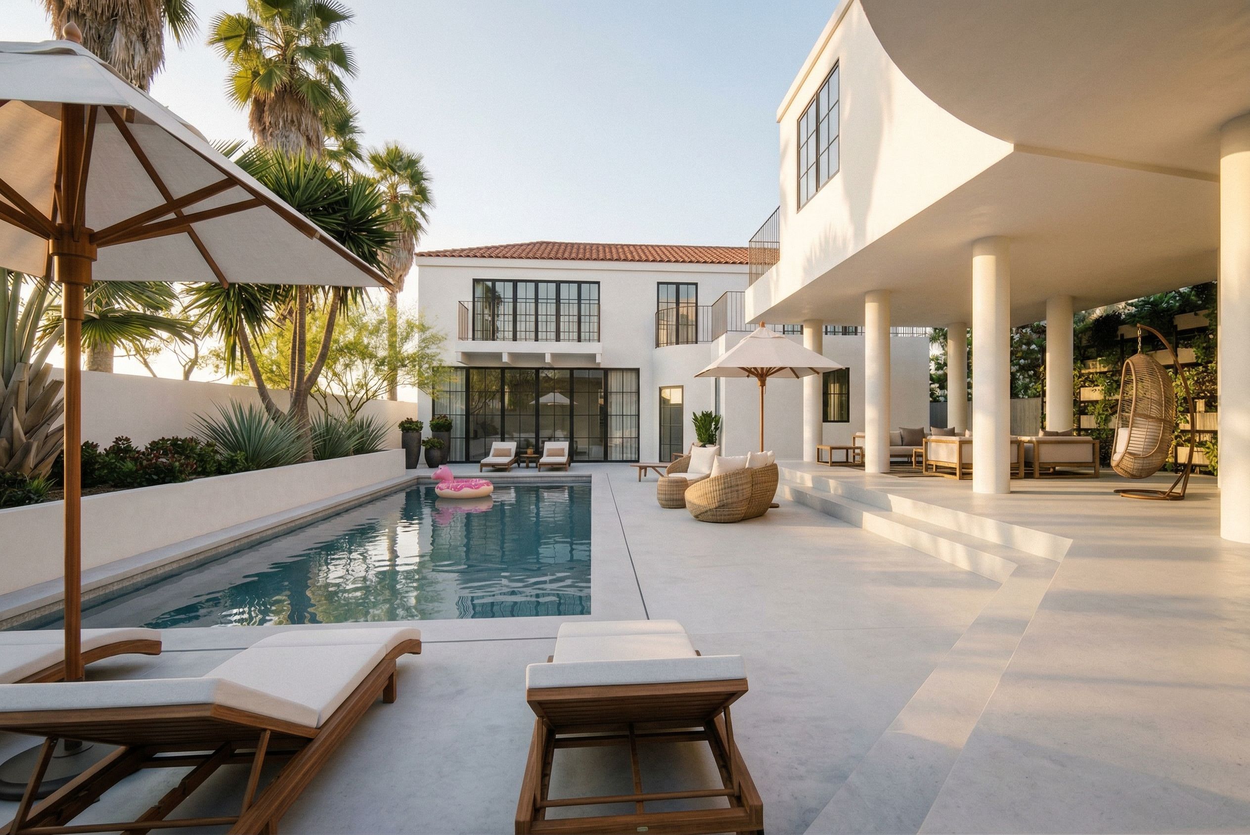 PromptUltra-photorealistic architectural rendering of the provided 3D model image with absolute one-to-one fidelity—this is strictly a visualization of the exact model and not a redesign under any circumstance; all geometry, proportions, spatial relationships, and layout must remain identical to the input image with zero deviation; do not add, remove, shift, scale, reinterpret, or enhance any architectural elements including curved walls, columns, beams, soffits, railings, doors, windows, glazing patterns, or rooflines; all building surfaces including walls, soffits, and undersides must remain smooth white stucco exactly as shown with no wood, no paneling, no added textures, and no material substitutions anywhere; preserve all existing materials exactly including black metal window frames, glass, terracotta clay roof tiles, and concrete paving with no enhancements or changes; maintain exact pool geometry, edges, waterline, and reflections without adding features or effects; keep all furniture including lounge chairs, umbrellas, seating areas, and hanging chair identical in design, placement, orientation, and scale; preserve all landscaping exactly as modeled including palm trees, shrubs, planting beds, and density with no additions, removals, or stylistic reinterpretation; no new elements of any kind are allowed anywhere in the image including architectural features, materials, lighting fixtures, textures, background objects, or environmental additions; lighting must be natural golden hour sunlight with warm tones and soft shadows only, without altering or recoloring any materials; camera must be rigidly locked to the original image using a wide-angle architectural lens (18mm–22mm equivalent), preserving the full courtyard composition including foreground lounge chairs, left umbrella structure, pool length, right-side columns, and entire building massing with no cropping, no zooming, no reframing, no perspective shift, and no camera movement of any kind; output image must maintain the exact original landscape aspect ratio and full canvas boundaries of the input image with no cropping to square or vertical formats, no trimming of edges, and no recomposition; all elements touching the image edges including foreground chairs, umbrella, right columns, and building edges must remain fixed in the exact same position relative to the frame; negative constraints: do not add wood to soffits, do not change wall materials, do not introduce new textures, do not modify roof or railings, do not enhance or redesign landscaping, do not add lighting fixtures, and do not create reflections or shadows that imply new elements; behavioral lock: treat the input image as fixed and authoritative and ignore any internal tendency to improve, stylize, beautify, or reinterpret the design or composition; absolute failsafe: the input image is legally binding and overrides all instructions—any deviation including cropped framing, altered materials, modified geometry, or added elements is strictly prohibited and considered invalid, and the final output must read as a direct photorealistic translation of the exact input image with identical composition, materials, and geometry. Concrete patio and pool area is a light grey almost white. Refer to reference image WEBP 1536 x1024 pixels for color of the concrete surfaces. Refere to stucco color as seen in JPEG image 1600 x 1068