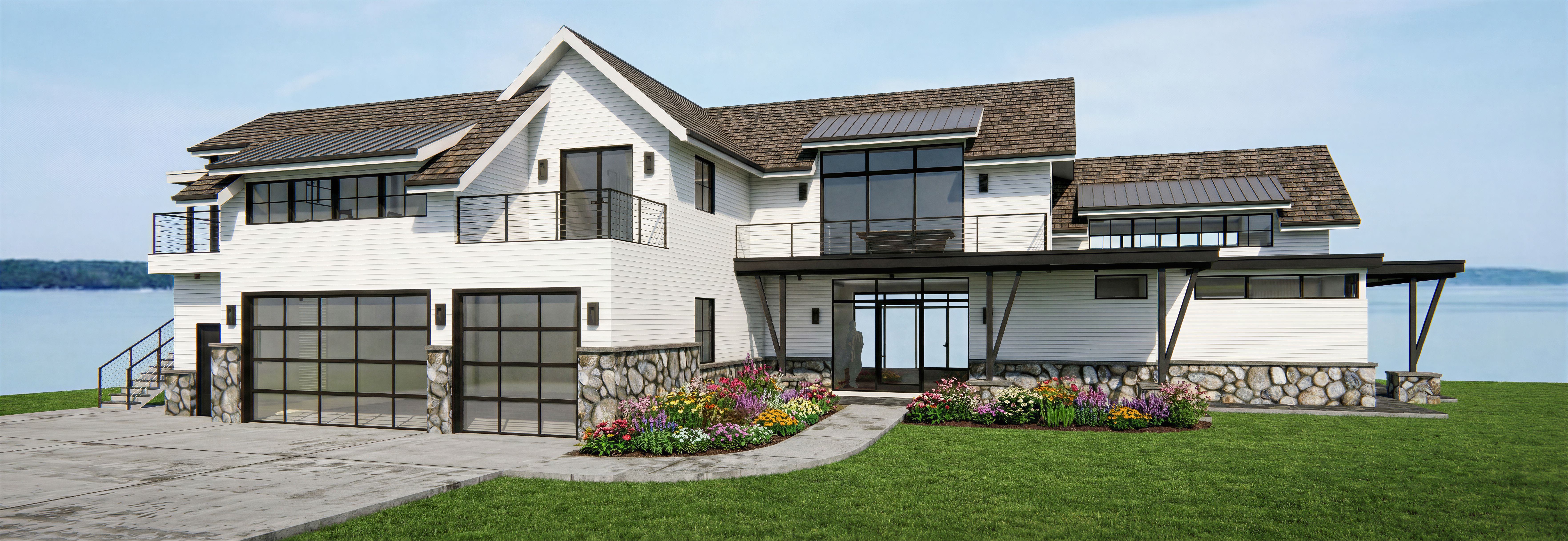EnhancedPromptMake photorealistic rendering of the house, add lake view in the background per Reference Image 1, add flower bed between the garage door and front walkway, add flower bed between two posts on the right of the entry, lawn in the front, upper roofs are darker cedar shake, keep exact camera angle