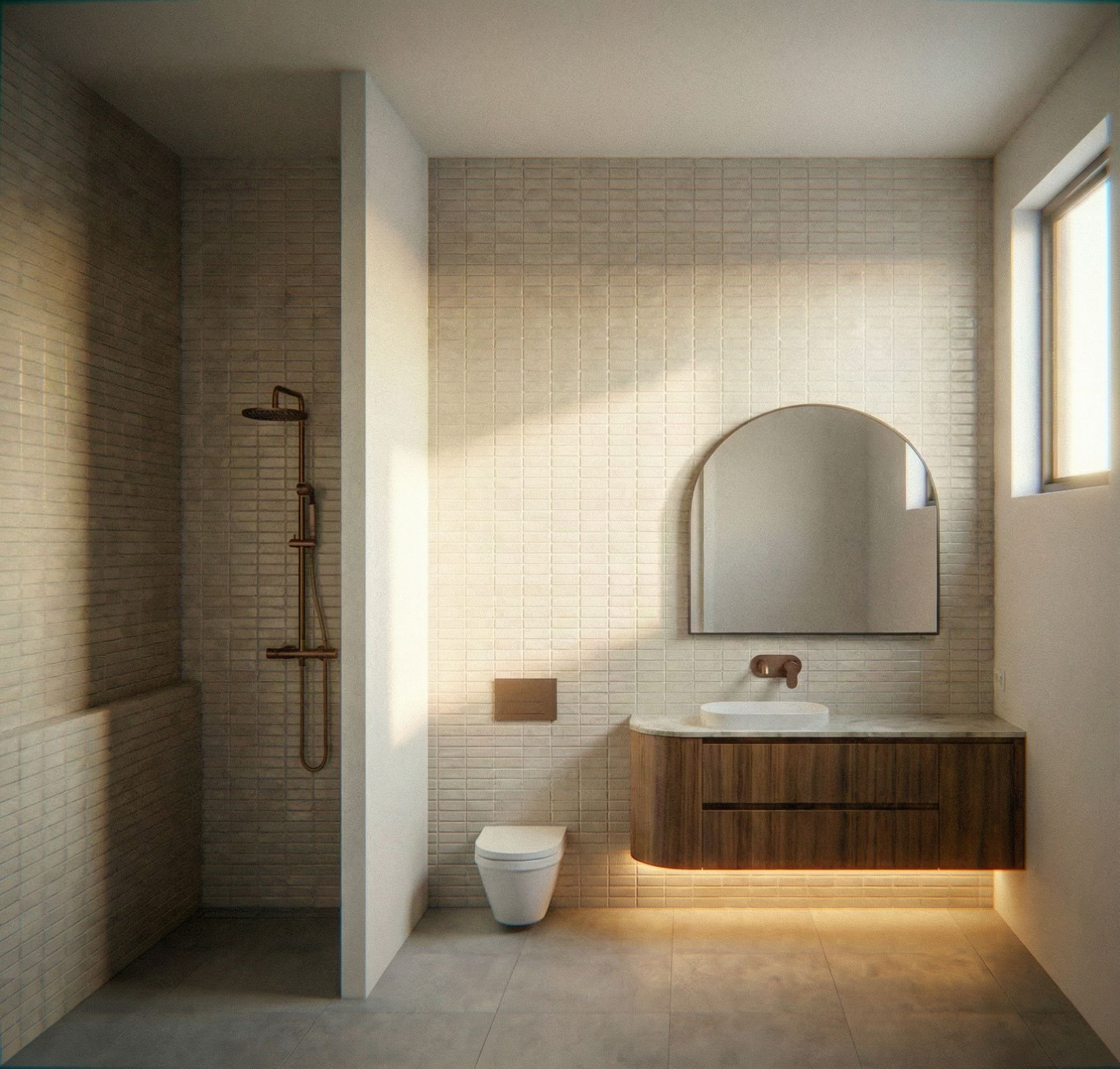 PromptAdd strip lighting under vanity. tile nib wall, keep exact camera angle