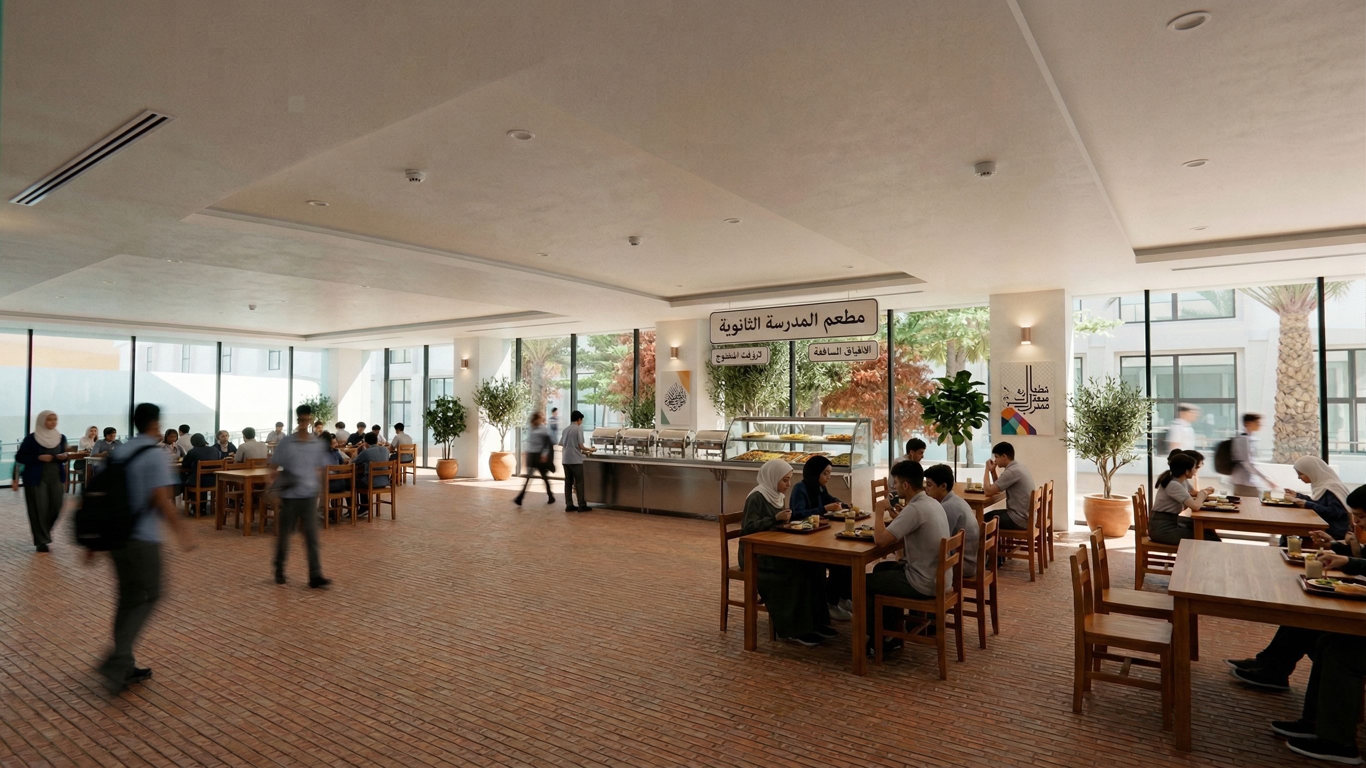 this is the interior of a cafeteria of a syrian arab school where highschool students relax and eat their lunch and interact . do simple interior design for school buffet, keep exact camera angle