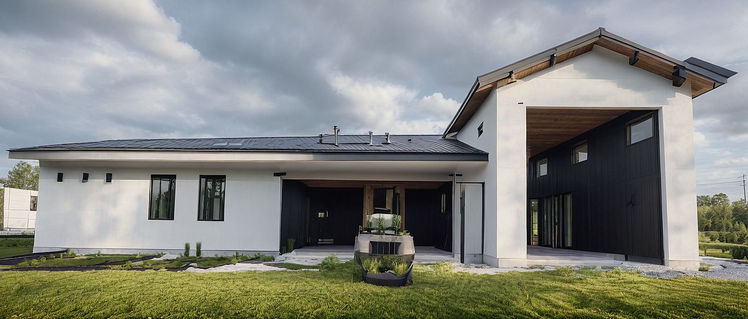 PromptExterior white stucco walls, modern farmhouse, black standing seam roof, grass landscaping