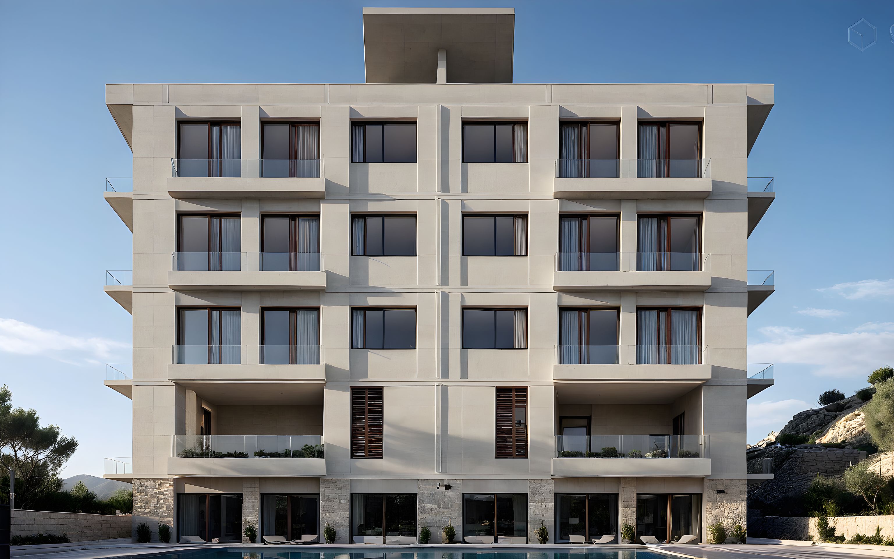 PromptPhoto of a modern multi-story residential building with a sleek façade featuring large windows and a Mediterranean design. Highlight the smooth concrete textures, horizontal and vertical lines, beige shaded stone designs and strategically placed balconies. Set in an mountain environment with nearby olive trees, emphasizing the architectural synergies. Capture mid-afternoon natural lighting, casting soft shadows across the surfaces, enhancing depth. Use a slightly elevated camera angle with a wide lens to showcase the building's scale and integration within its surroundings, while maintaining clear visibility of design details and context.