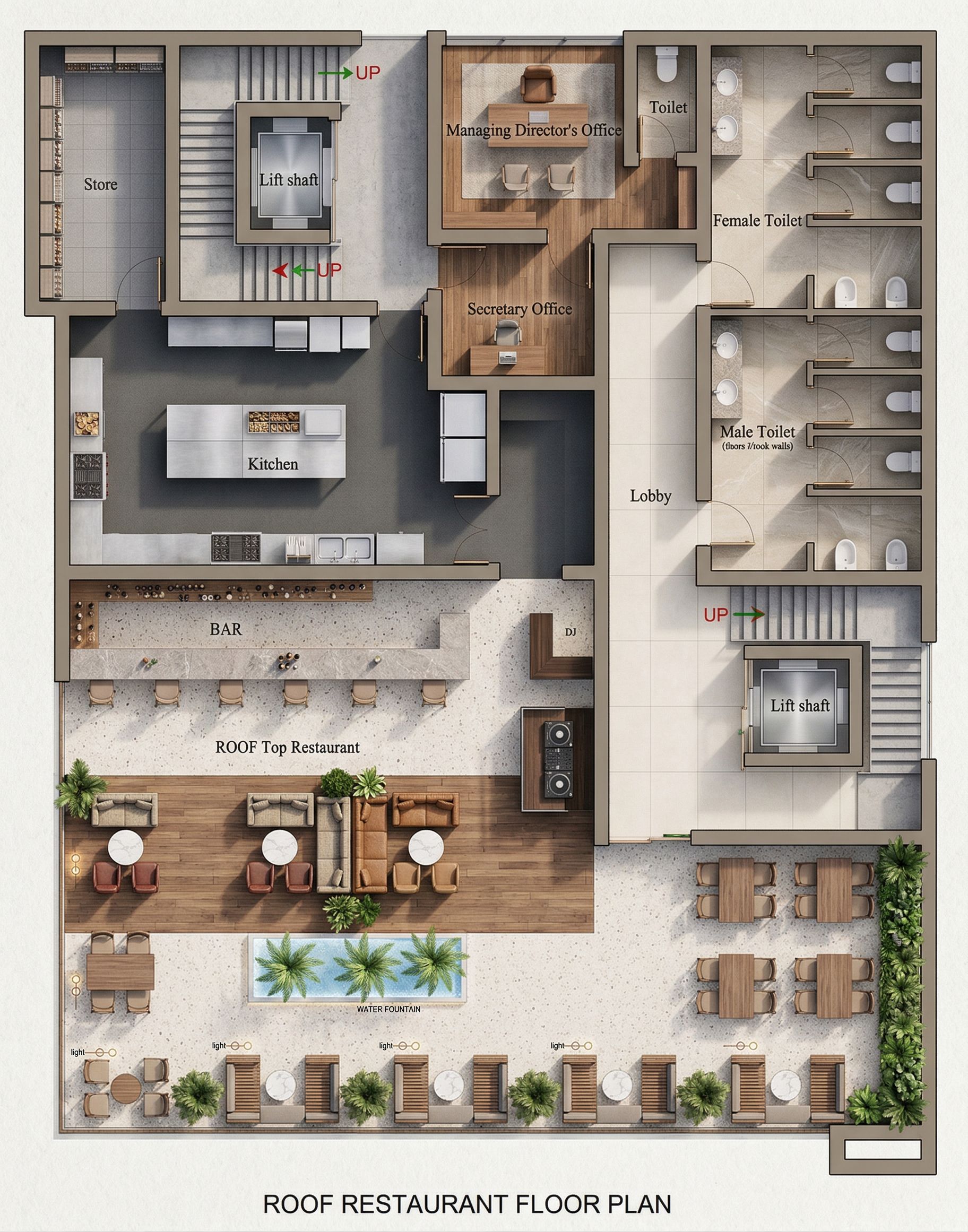 PromptGenerate a photorealistic 2D rendered floor plan in top view, showing a complete interior layout with realistic furniture, textures, finishes, clean color effects, The plan should include: labeled rooms modern furniture arrangement floor materials differentiation walls, doors, and windows decorative interior styling Style: luxury modern interior, elegant, warm, clean, premium presentation board style. Use beige, wood, white, grey, and soft earthy tones. The composition should be suitable for an interior design portfolio and client presentation., keep exact camera angle