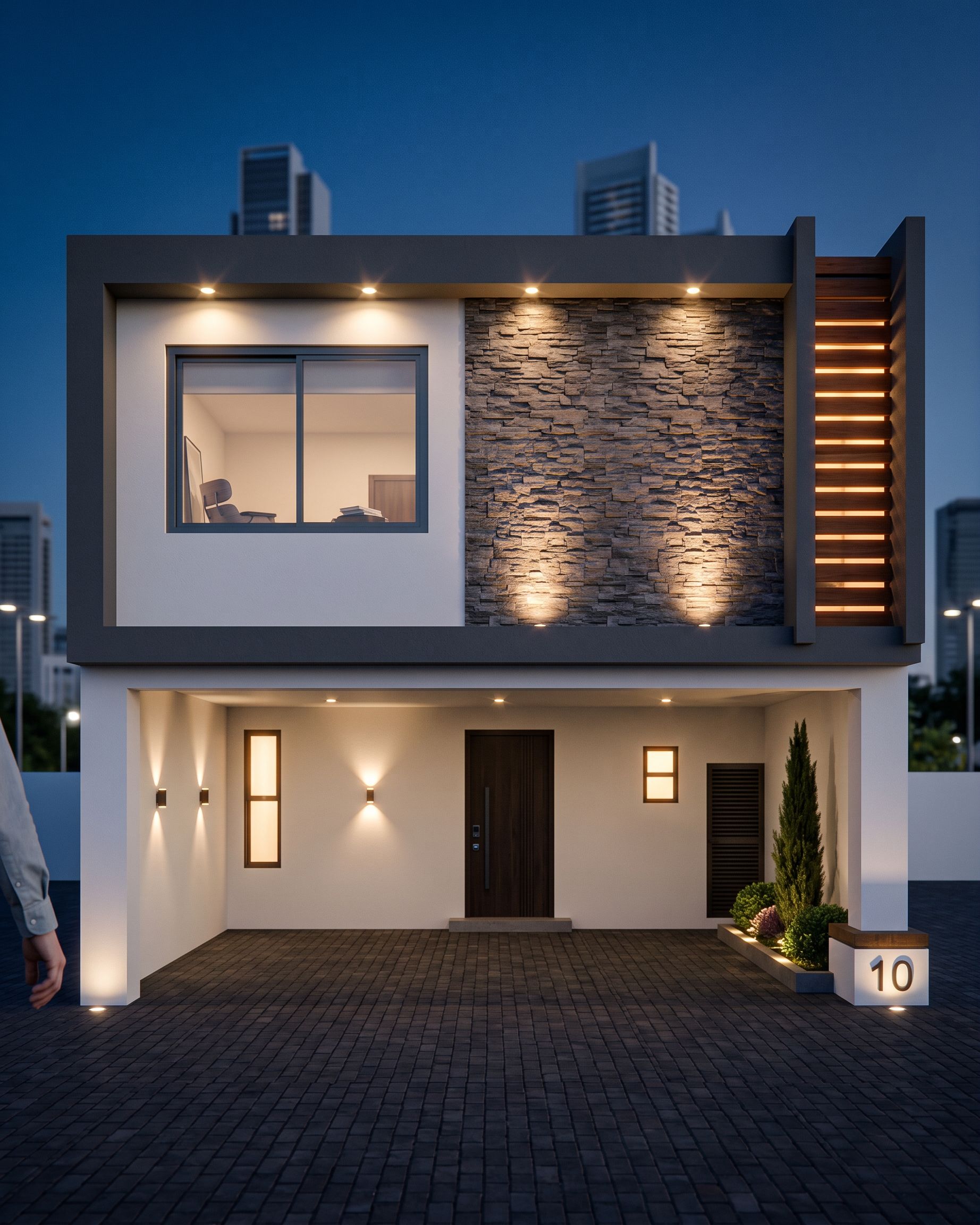 PromptPhoto of a modern two-story residential building, showing an elegant facade with a mix of stone cladding texture and smooth white walls. Highlight the large windows to bring in natural light, Set against an urban backdrop of subtle greenery. The scene captures the bright light of day, creating soft shadows and vibrant highlights. View from a slightly elevated angle to emphasize height and design features, using a wide-angle lens for a wide perspective. Maintain the exact camera angle. improving the quality of materials and adding lights to the façade, keep exact camera angle