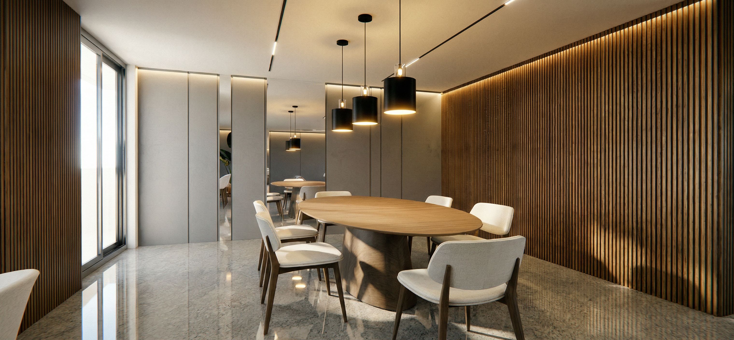 Por favor haz este render una imagen realista, cambia el piso ya que es granito de color gris claro se debe ver el brillo y añade las tres lámparas que están sobre la mesa te adjunto la referencia , keep exact camera angle