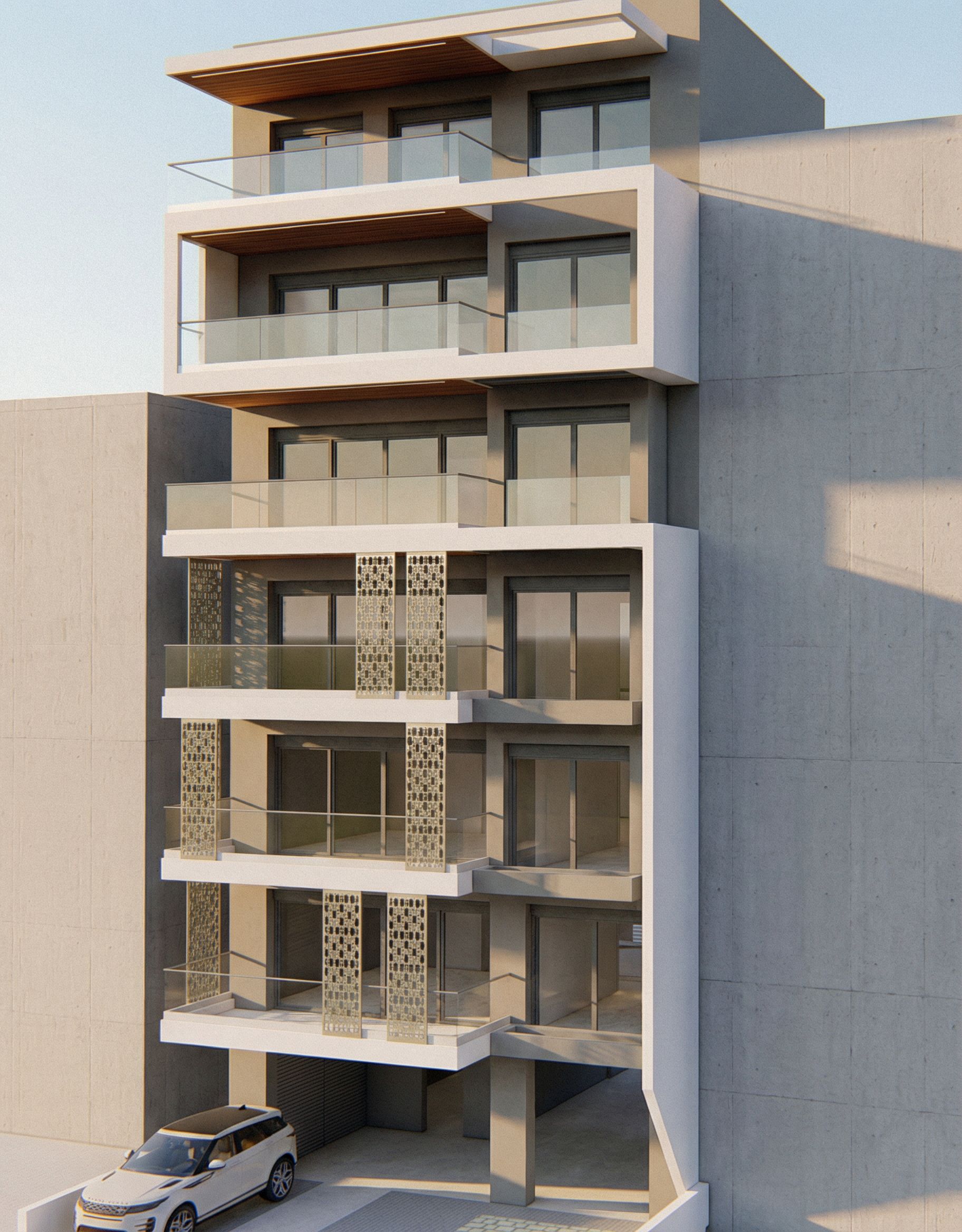 PromptPhoto of a modern apartment building featuring sleek lines and contemporary balconies. Emphasize , expansive glass windows, and wooden tops of balcony accents. Capture natural sunlight enhancing the architectural details, with soft shadows cast by the balconies. Basic color ral 7006 and some beige details with white balconies. Dont change the building. No trees .Do light grey the right and left box, keep exact camera angle