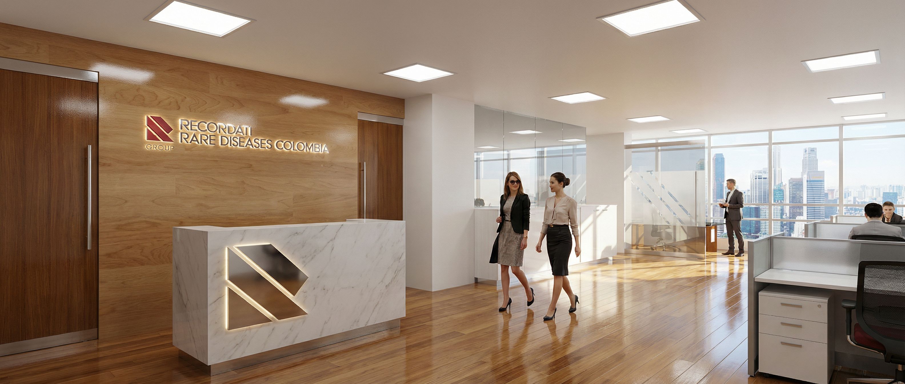 interior design rendering, render this sketch into photorealistic rendering, Modern office, ceiling white with recesed square lamps day ight, Recordati logo retro iluminated, letters in shinny metal, wood surfaces shinny, beautiful office people, glass panels semi transparent, exterior with skycrappers, sunny day, wood floor shinny, reception desk in white marble, and logo in shinny metal retro iluminated 2 sexy women walking as well, keep exact camera angle, high quality, professional, detailed scene