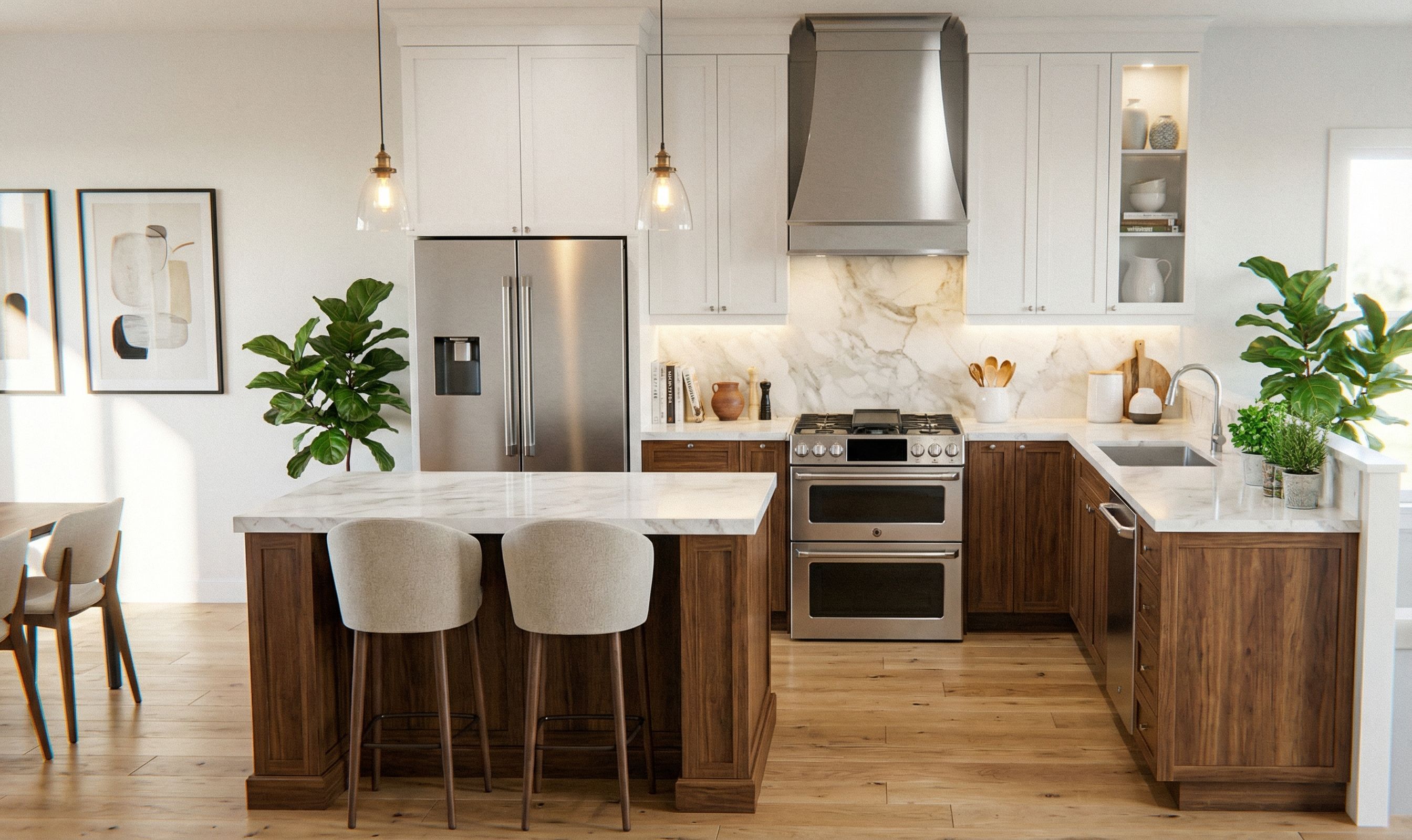 Promptdesigner kitchen, quartz counter, wood floor, wood lower cabinets, have fun with this design! full sun all sides
