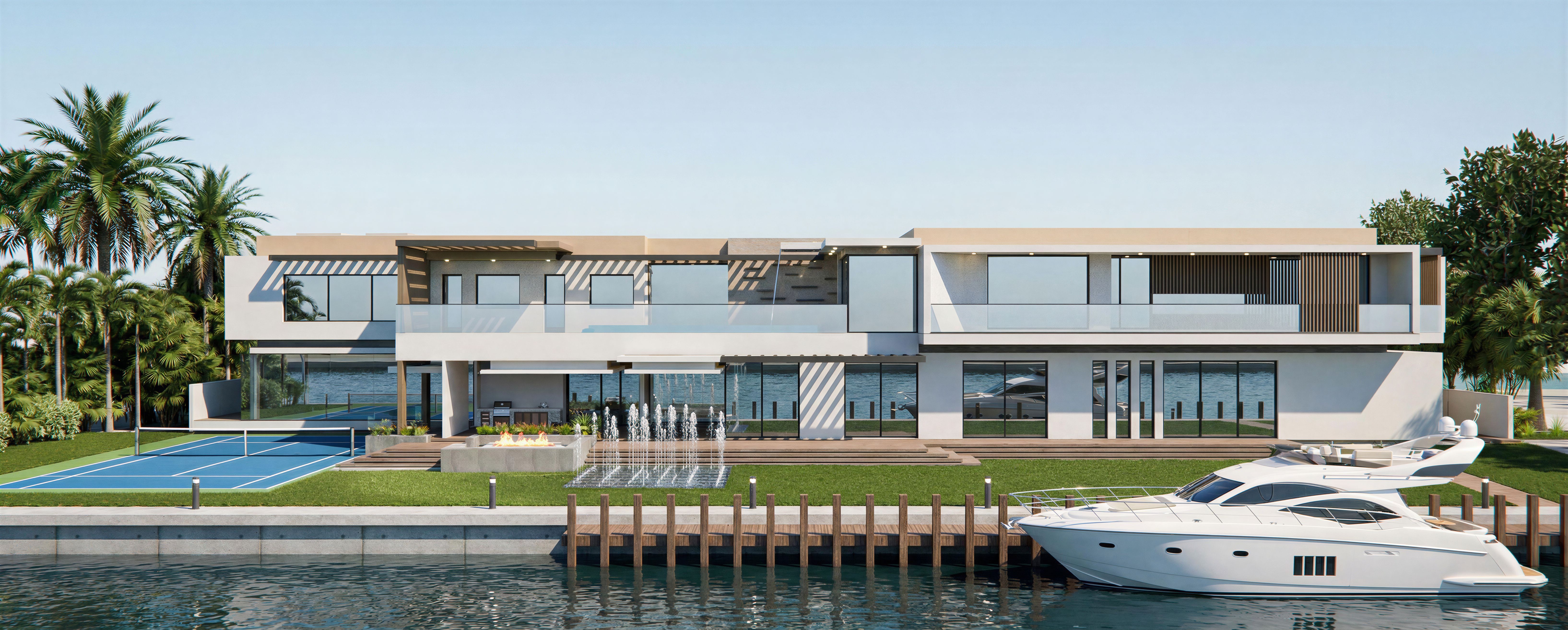 RENDER HIPERREALISTA. CASA MODERNA. PONER SOLO VEGETACION EN LOS EXTREMOS DEL TERRENO. SOLO MOSTRAR LA VEGETACION QUE SE MUESTRA EN LA IMAGEN PERO CON MEJOR CALIDAD. TODOS LOS VIDRIOS LOW E CLEAR REFLECTIVE. NO MOSTRAR NINGUN REFLEJO DE PLAMERAS EN LOS VIDRIOS DE LOS BALCONES DEL SEGUNDO PISO NI DEL PRIMER PISO . EN LOS VIDRIOS DEL PRIMER PISO MOSTRAR REFLEJOS LEVES DEL CANAL. MOSTRAR LA FUENTE QUE SE VE EN LA IMAGEN EN EL JARDIN. TAMBIEN MOSTRAR EL FIRE PIT. COLOCAR UN YATE BLANCO ATRACANDO EN EL ATRACADERO QUE APAREDE EN LA IMAGEN. REPREESENTAR EL AGUA DEL CANAL CON UNA LEVE ONDULACION Y REFLEXIMIDAD MEDIA. COLOCAR LUCES MINI LED REDONDA EN LOS TECHOS EXTERIORES DE LA CASA MENOS EN LAS PERGOLAS. COLOCAR ALGUNAS REFLECTORES DEBAJO DEL AGUA CON LUCES MUY TENUES. COLOCAR LUMINARIAS DE PISO BAJITAS AL LADO DEL CAMINO DEL ATRACADERO. NO MOSTRAR NINGUN MUEBLE EN EL INTERIOR DE LA CASA. SOLAMENTE UNA ILUMINACION GENERAL MUY BAJITA. CONSERVAR LOS COLORES DE LA CANCHA DE PADDLE . Y CONSERVAR LO DEMAS DE LA MANERA MAS FIEL A LA IMAGEN, keep exact camera angle