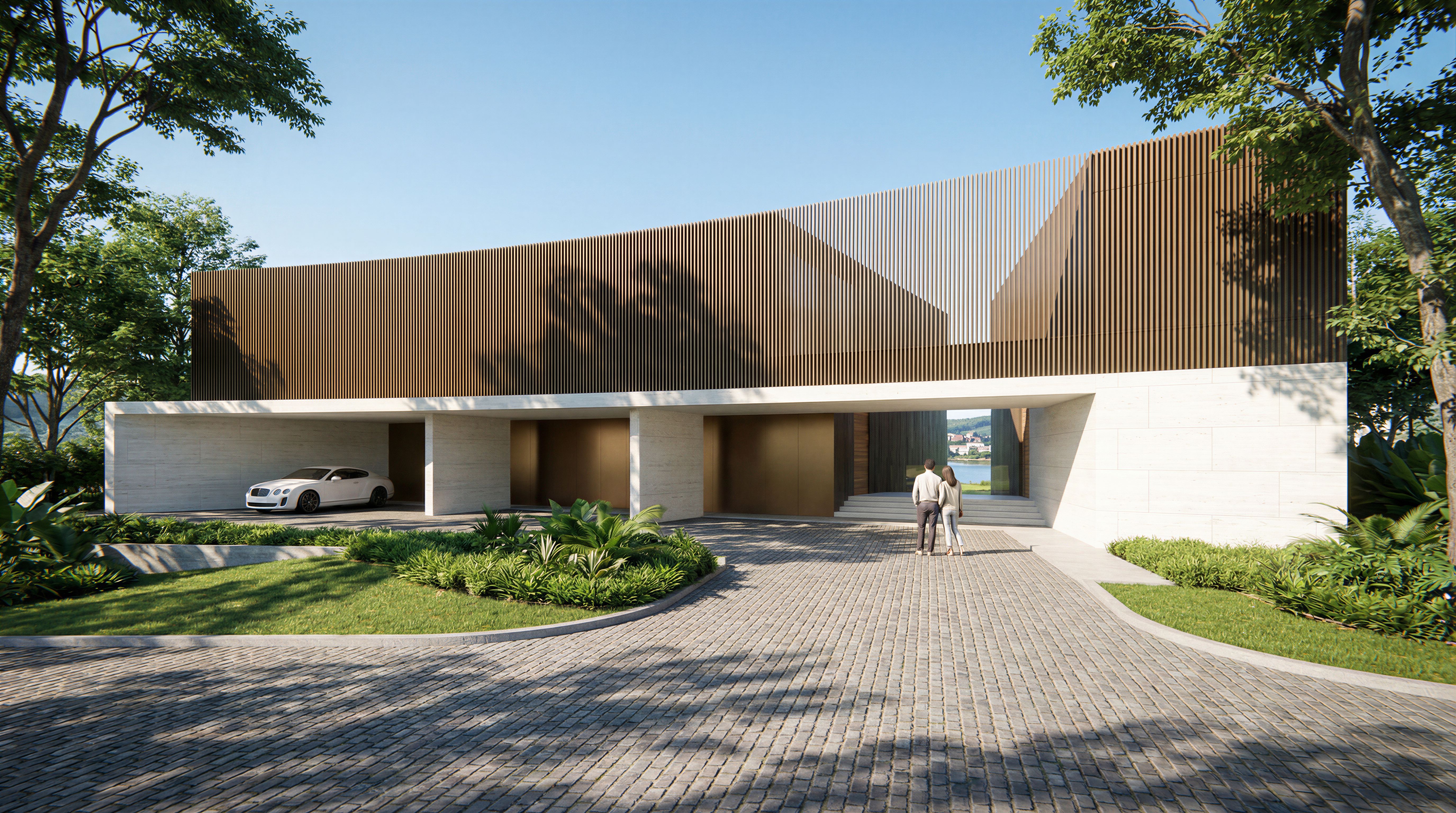EnhancedPromptCore Subject & Architecture: A photorealistic architectural rendering of a massive, sprawling ultra-minimal luxury residence with a continuous curved form. The facade features a sophisticated blend of large White Travertine stone slabs on the lower level and a continuous upper volume clad in bronze-colored vertical aluminum louvers, following the sleek curves of the structure. The back wall of the carport is finished in premium bronze cladding, while other sections showcase wood-textured form-worked concrete. Environment & Landscaping: The house is situated along an entrance road paved with long, narrow rectangular cobblestones in a running bond (brick) pattern. The surroundings are lush with curved tropical landscaping, featuring vibrant greenery and large mature trees in the foreground and background. The village environment is serene and shaded, with leaves sparkling under the evening sun. Specific Layout & Details: On the far left of the ground floor, there is a two-bay carport; a white Bentley is parked facing outward in the leftmost bay. On the far right, the entrance area features a four-step grand staircase leading up. At the top of the stairs, an attractive Korean couple (man and woman) with celebrity-like features, dressed in casual-chic attire, stand with their backs to the camera. They are gazing through a tall, narrow architectural void between the building masses toward a distant lake and a hillside village in the basin below. This narrow gap is beautifully illuminated by natural light washing down the bronze walls from a skylight above. Lighting & Atmosphere: Captured during the morning hour with a clear blue sky. The sun is positioned in the East (front of the house), creating intricate and beautiful dappled shadows cast by the branches of large foreground trees across the grassy slopes, the cobblestone road, and the house facade. The overall tone is soft, lush, and natural, avoiding oversaturation, with a high-end, peaceful luxury atmosphere., keep exact camera angle