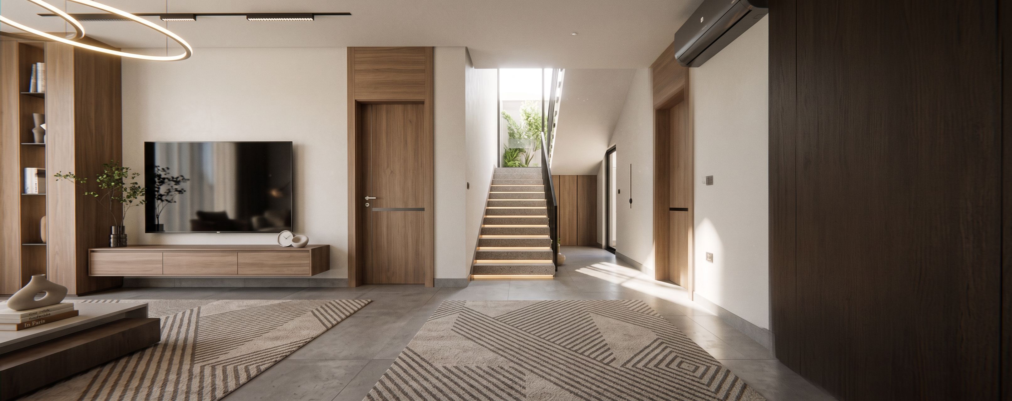 عايز رندر احترافي باقوى محركات الرندر من كورونا . علما بان درجة لون الابواب الخشبية بخشب يسمى Light Matte Walnut . و عايز اضيف انارة مخفية تحت الدرج . و عايز درجة لون خشب مكتبة الشاشة بخشب يسمى Light Matte Walnut