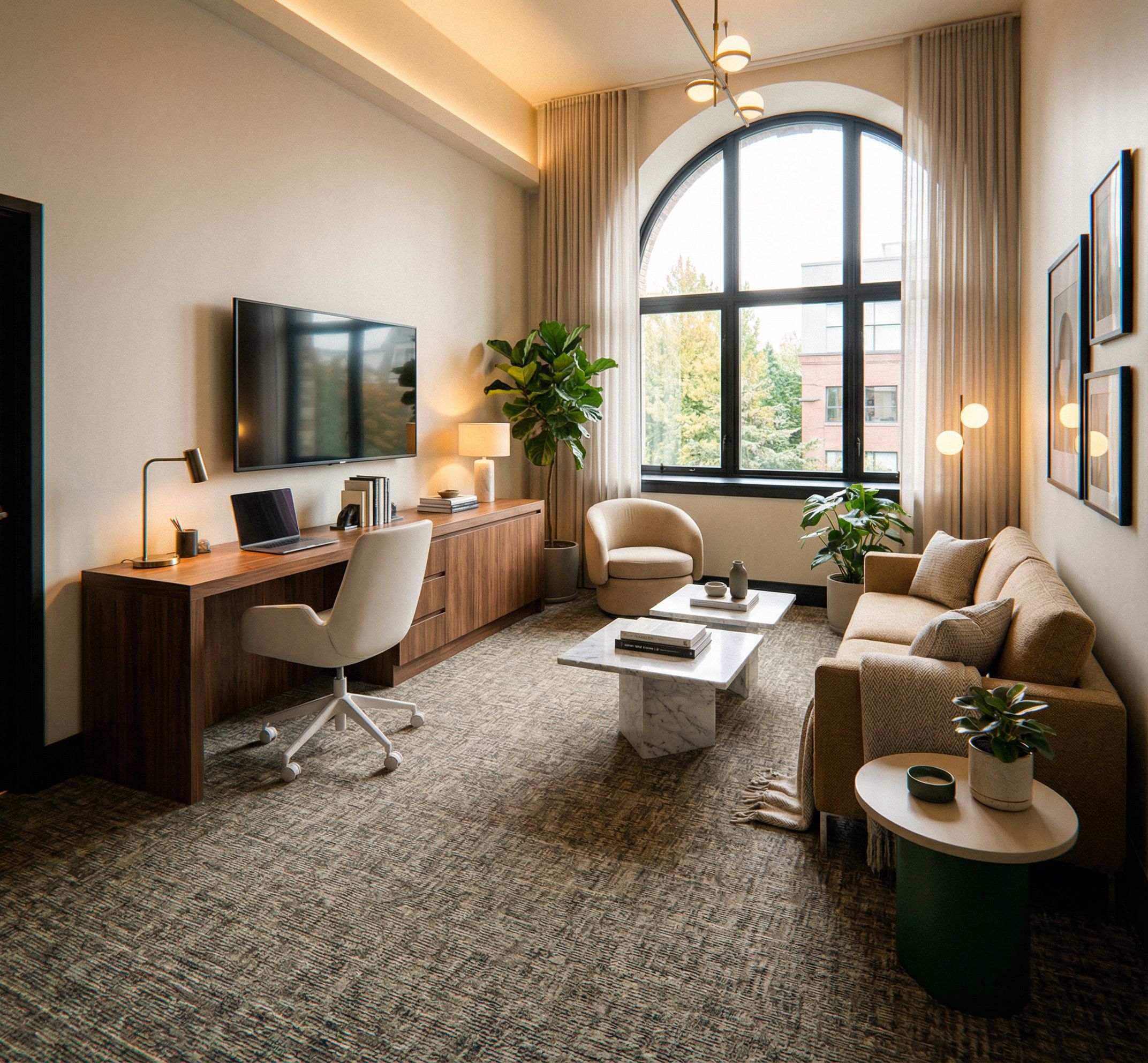 photorealistic render at eye level wide angle of this 3D model within the suite of a luxury hotel. this is on the 2nd floor located in Vancouver, Canada. please place trees and/or buildings outside the arched windows. please keep furnishings and layout the same, but add a television above the desk/tv console on the LEFT hand wall., keep exact camera angle