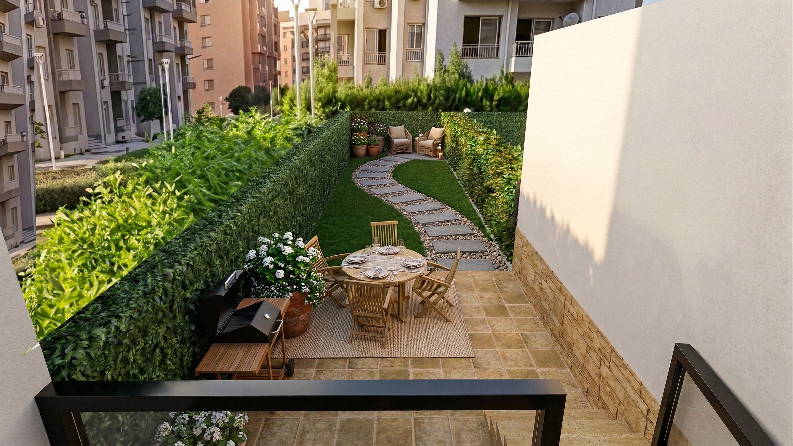 Perspective of a modern residential courtyard featuring a cozy outdoor dining area. Architectural details include sleek stone pavements, elegant wooden furniture, and lush greenery along the perimeter. The urban environment is complemented by low-rise apartment buildings in the background, creating a serene atmosphere. Warm afternoon light enhances the textures of the wood and stone, casting gentle shadows. Aerial view from a slightly elevated angle, using a wide-angle lens to capture the inviting layout and vibrant colors of the plants and furnishings., keep exact camera angle