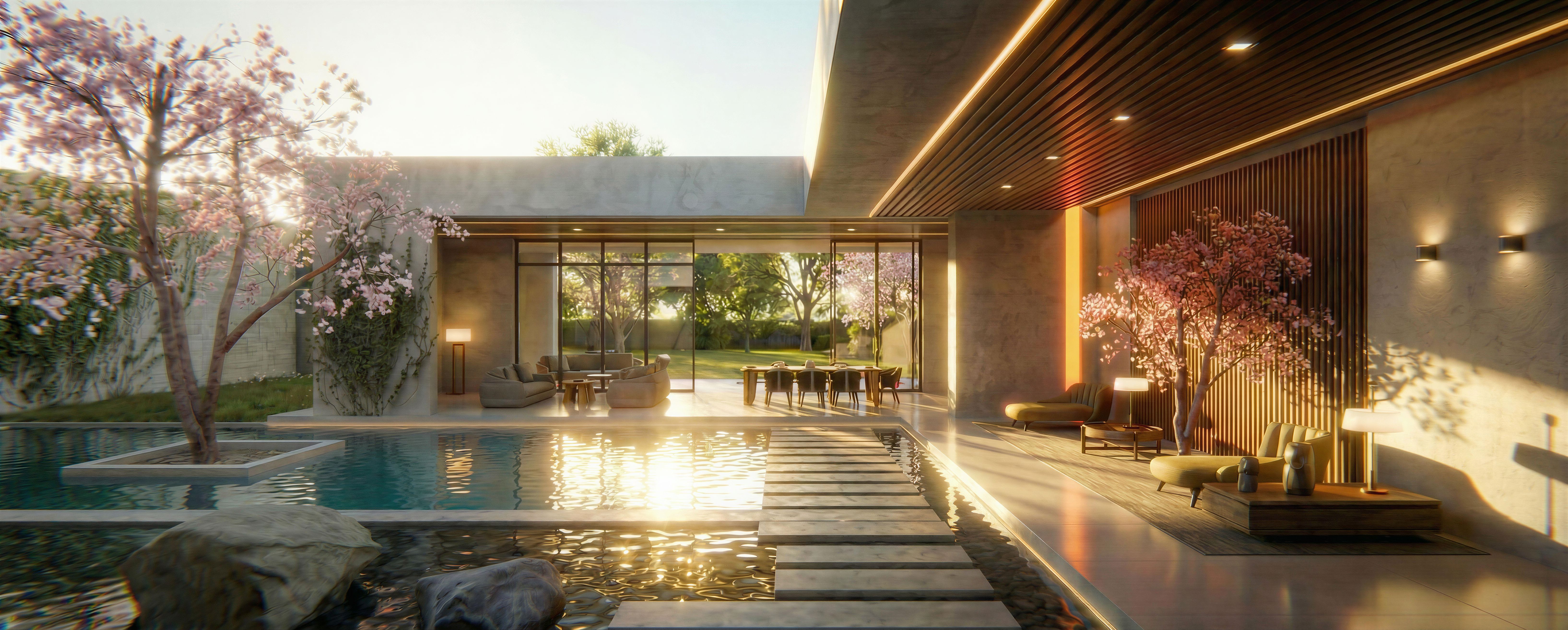 PromptHACER QUE EL SOL ILUMINE EL ESPEJO DE AGUA Y EL AMBIENTE DE LOS CHAISE LONGE , keep exact camera angle