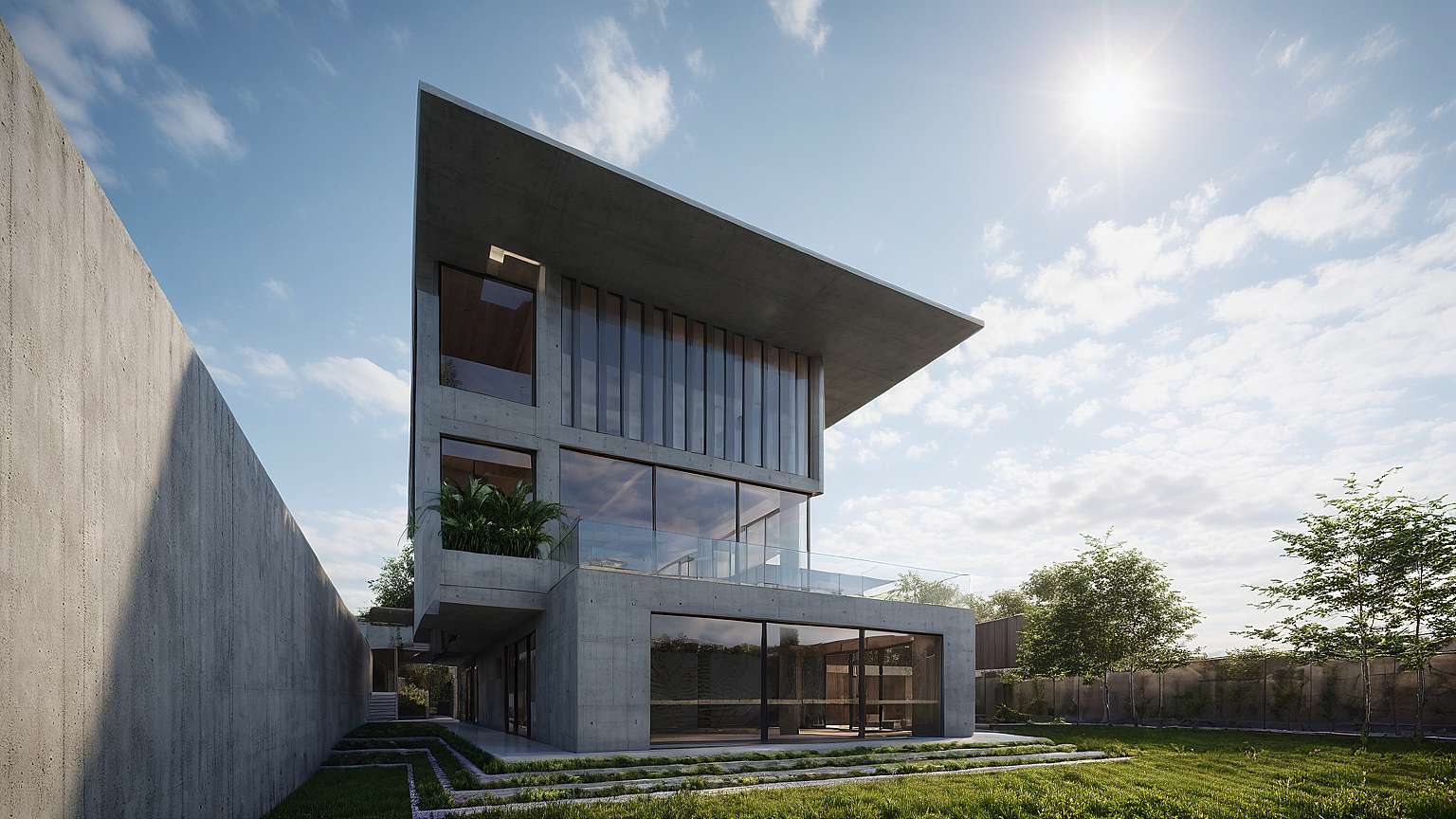 Promptmodern house in concret with glass with furniture in the interior and exterior. front grass garden. vertical garden in the side wall