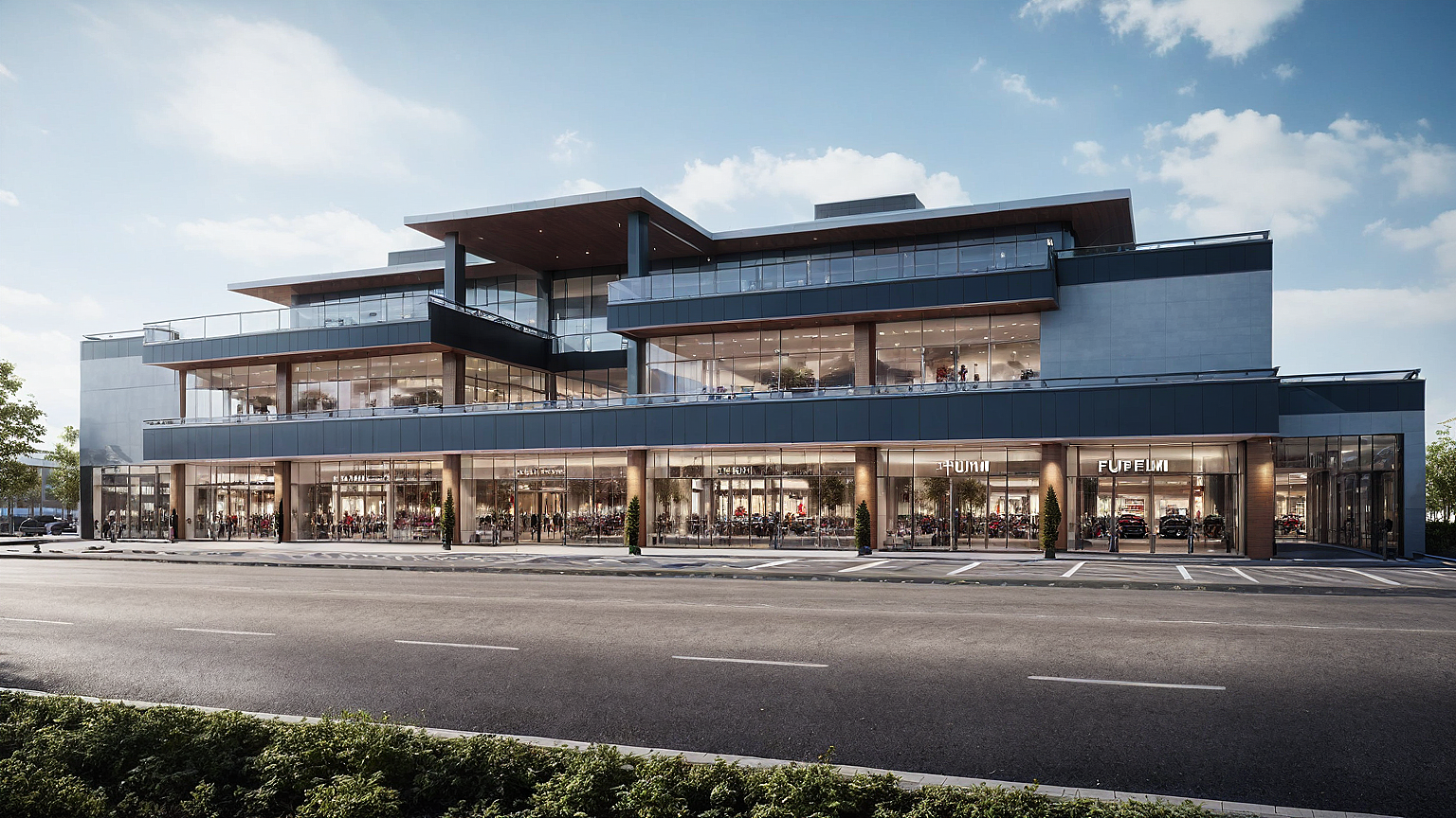 Promptshopping mall, cars, trees, people, realistic rendering, modern facade, realistic sky, parked cars, lighting on the facade, small trees in front of the building, people walking, cars passing by