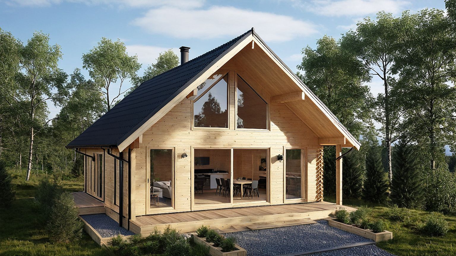 PromptModern compact log home for nature-inspired living The Honka Sirius 90 combines clean Nordic architecture with the warmth and authenticity of natural wood. Built from laminated pine logs (Honka MLL134), this compact model is ideal as a holiday home, rental property, or a cozy permanent residence. The front façade is defined by a large glass wall with double sliding doors that connect the dining area to a spacious terrace. Inside, the high ceilings, exposed wooden beams, and open-plan layout create a bright and inviting atmosphere. The loft area provides additional sleeping or relaxation space, making the most of every square meter. Key Features: Total floor area: 90 m² Structure: Laminated pine log MLL134 Layout: Ground floor + loft Glazing: Large sliding glass door + panoramic gable windows Interior layout: Open-plan living/dining/kitchen area, one ground-floor bedroom, extra space in the loft Best suited for: Holiday home, rental retreat, or compact year-round living