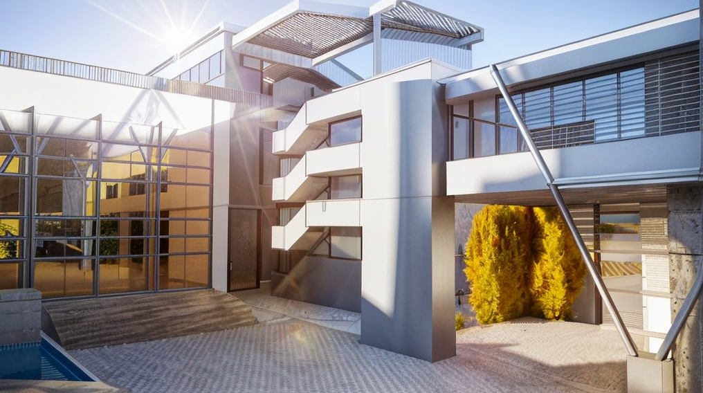 modern steel building with a mural art, warm light inside