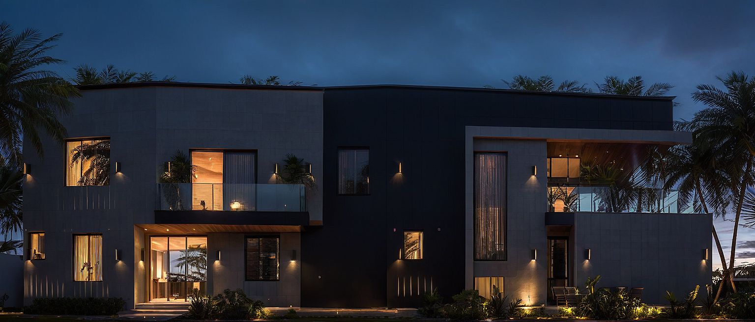 PromptPhoto of a modern residential building featuring a blend of concrete and dark façade elements. Highlight the large, reflective windows, and unique balcony design. Surrounded by lush palm trees and vibrant landscaping, set against a backdrop of a twilight sky. Soft artificial lighting casts warm glows on the structure, enhancing its architectural details. Capture the scene from a low angle, showcasing the building's height and dramatic shadows, with a slight fisheye lens effect to emphasize its contemporary design.