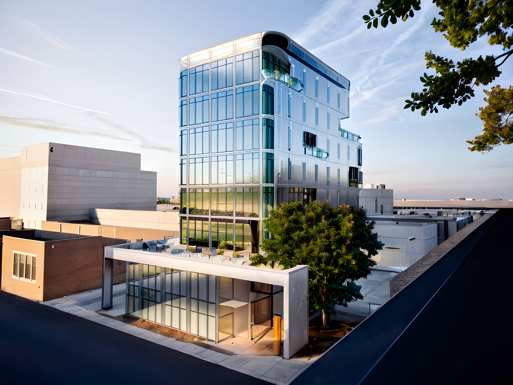 PromptCommercial glass futuristc architecture and similar office buildings in the background. sunrise sky with reflective glass, trees along the street and cars and people on the street, car showroom on the ground floor, dense foliage in the background, dark blue reflective glass on the facade with silver aluminium frames, clean and modern streetscape