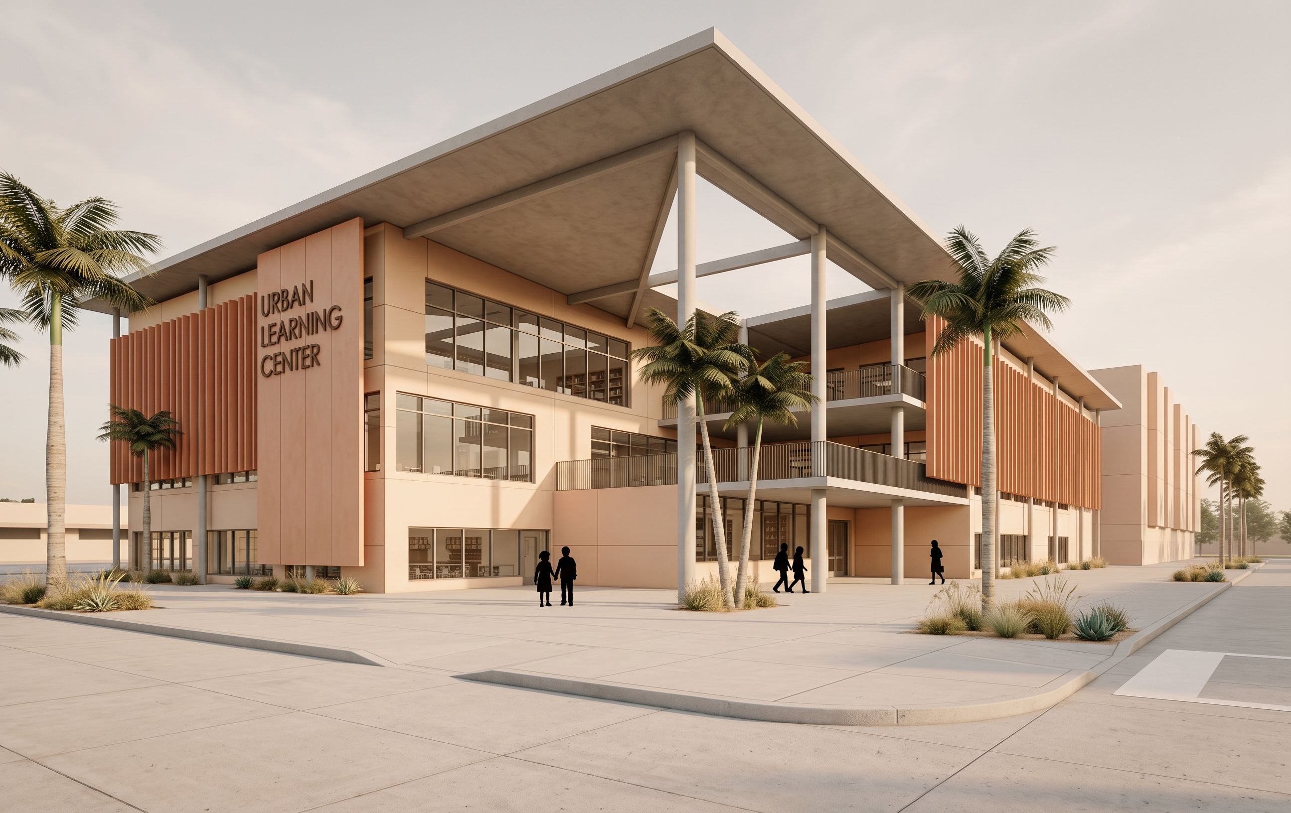 Enhance this architectural exterior rendering while keeping the EXACT geometry, proportions, camera angle, and all building elements unchanged. DO NOT redesign, move, add, or remove any architectural components. Only apply materials, lighting, and atmosphere. -------------------------------------------------- FACADE MATERIALS VERY IMPORTANT: - Replace all orange brick shading elements with: → terracotta vertical fins warm natural terracotta tone, matte finish - Exterior wall panels: → light terracotta / creamy beige tone smooth panel finish, soft warm color - Structure: → exposed concrete columns and slabs light gray, smooth finish - Glazing: → clear glass with subtle reflection not mirror-like -------------------------------------------------- SHADING SYSTEM: - Maintain exact spacing and geometry of vertical fins - Material: terracotta not brick - Slight variation in tone for realism - Cast soft linear shadows on facade and ground -------------------------------------------------- GROUND + SITE: - Light concrete pavement - Soft shadows from building and shading system - Minimal landscape do not add heavy vegetation -------------------------------------------------- PEOPLE STRICT RULE: - Use ONLY black silhouette people - Include children school scale - No facial features, no color, no realism Placement: - 3–6 figures max per view - walking near facade - 1–2 near entrance - 1–2 under shaded area - Add soft shadows under each figure -------------------------------------------------- LIGHTING: - Soft natural daylight late morning or afternoon - Warm sunlight tone - Emphasize shadows from terracotta fins - No dramatic sky, keep neutral -------------------------------------------------- ATMOSPHERE: - Clean, calm, architectural - Slight ambient occlusion for depth - No heavy contrast - No dramatic clouds -------------------------------------------------- POST-PROCESSING PHOTOSHOP STYLE: - Slight warmth boost - Light contrast increase - Soft shadows - Subtle vignette - Minimal grain -------------------------------------------------- IMPORTANT RESTRICTIONS: - DO NOT change building geometry - DO NOT modify facade layout - DO NOT change window sizes - DO NOT alter shading spacing - DO NOT replace elements - ONLY enhance materials, lighting, and silhouettes, keep exact camera angle