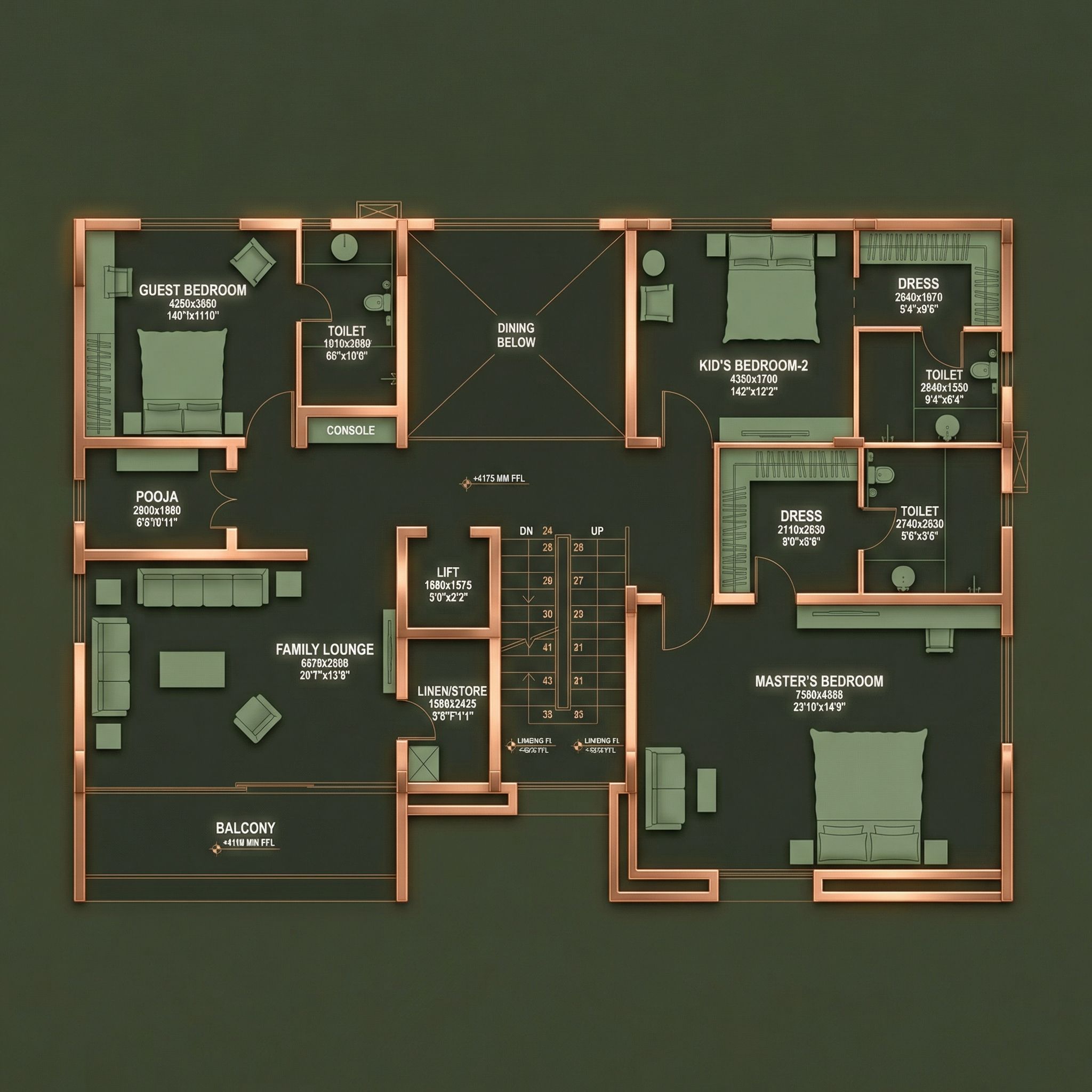 "prompt": "Create premium 2D marketing floor plan using uploaded drawing reference. Dark olive green background. Copper outline walls with soft bevel depth. Furniture in muted green tone. Add architectural text labels similar to real estate brochures. Main room titles bold uppercase white font size 38pt. Secondary room labels regular uppercase font size 22pt. Place text centered inside rooms. Add subtle glow shadow under text. Maintain clean spacing. Flat top-down orthographic view. Ultra crisp vector edges. HDR lighting. No watermark, no brand logos. Print ready output.",