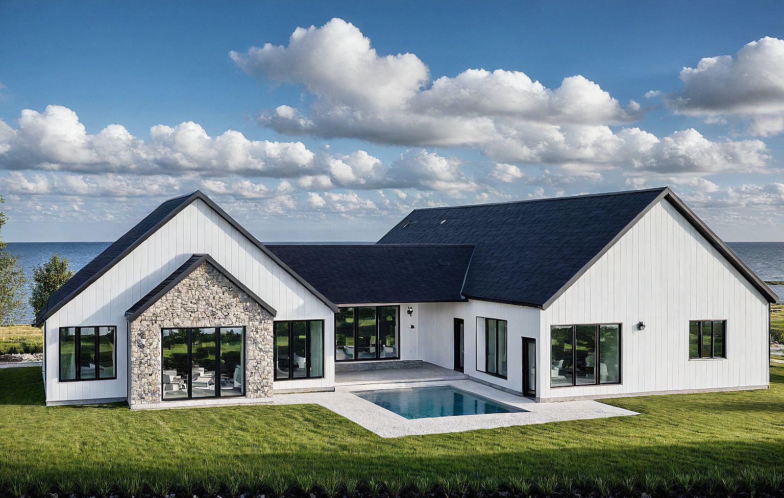 PromptAdd landscaping, trees, grass, blue skies with clouds, field back ground, black shingle roof, stone gable area, black windows, stone at the side, white vertical siding, concrete pad in front with a pool