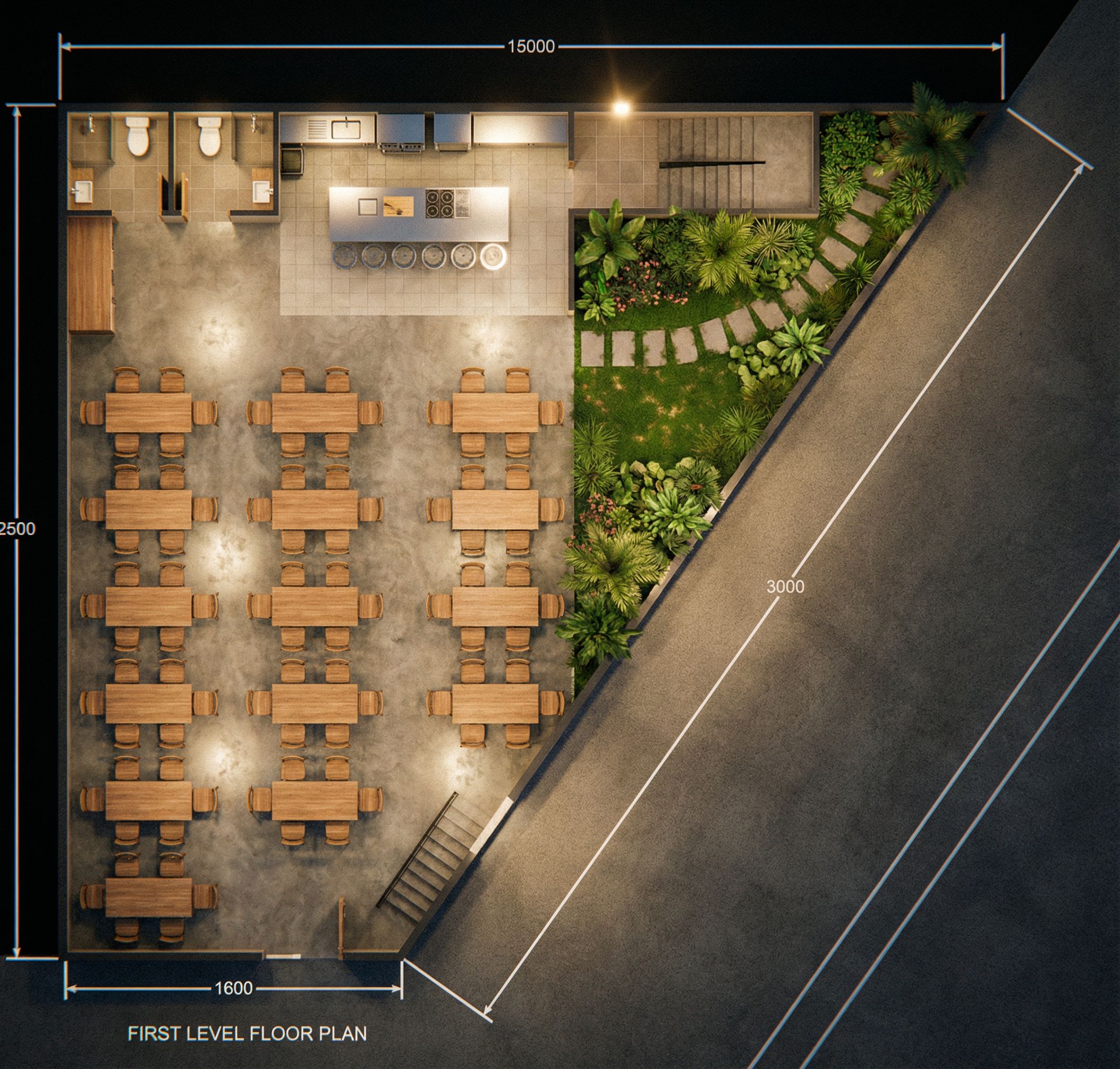 1ST LEVEL FLOOR PLAN SPECIAL EVENTS ROOM WITH 2 BATHS LARGE KITCHEN AREA AND SITTING TABLE S FOR 90 PEOPLE. ALONG WITH GREEN AREA , keep exact camera angle