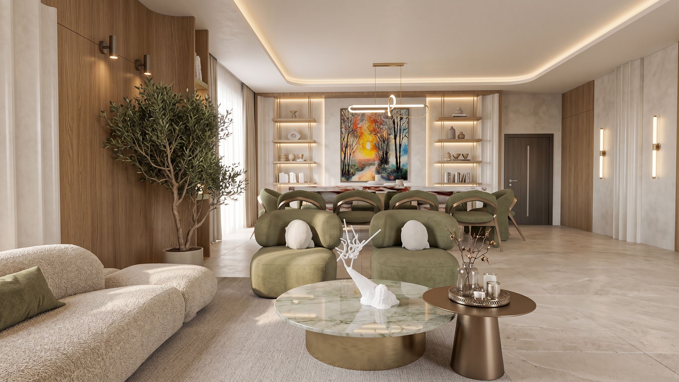 Ultra-realistic modern organic living room interior, soft minimal luxury style, warm neutral palette.
