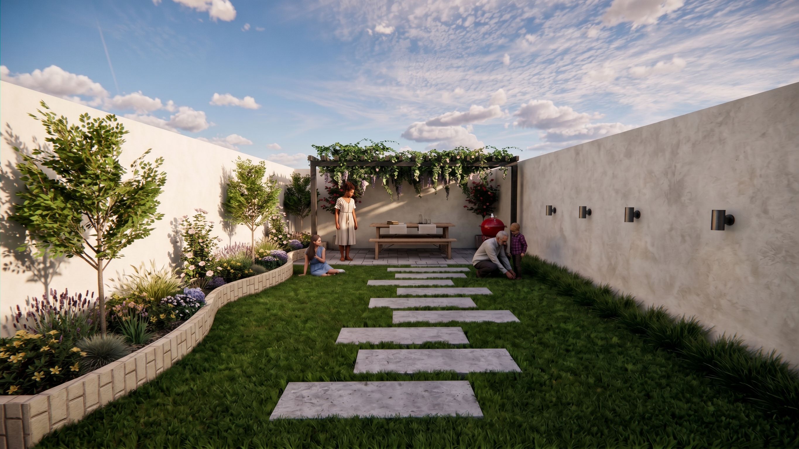 Photo of a contemporary outdoor garden space featuring a minimalist design with a paved seating area under a pergola adorned with greenery. Surrounding elements include manicured lawns, flower beds, and decorative stone pathways leading to a shaded rest area. Warm, natural daylight accentuates shadows and highlights, creating a serene ambiance. Captured at a slightly elevated angle, showcasing the depth of the space and the interaction of family members enjoying the serene environment, with a wide-angle perspective to emphasize openness and connection with nature., keep exact camera angle