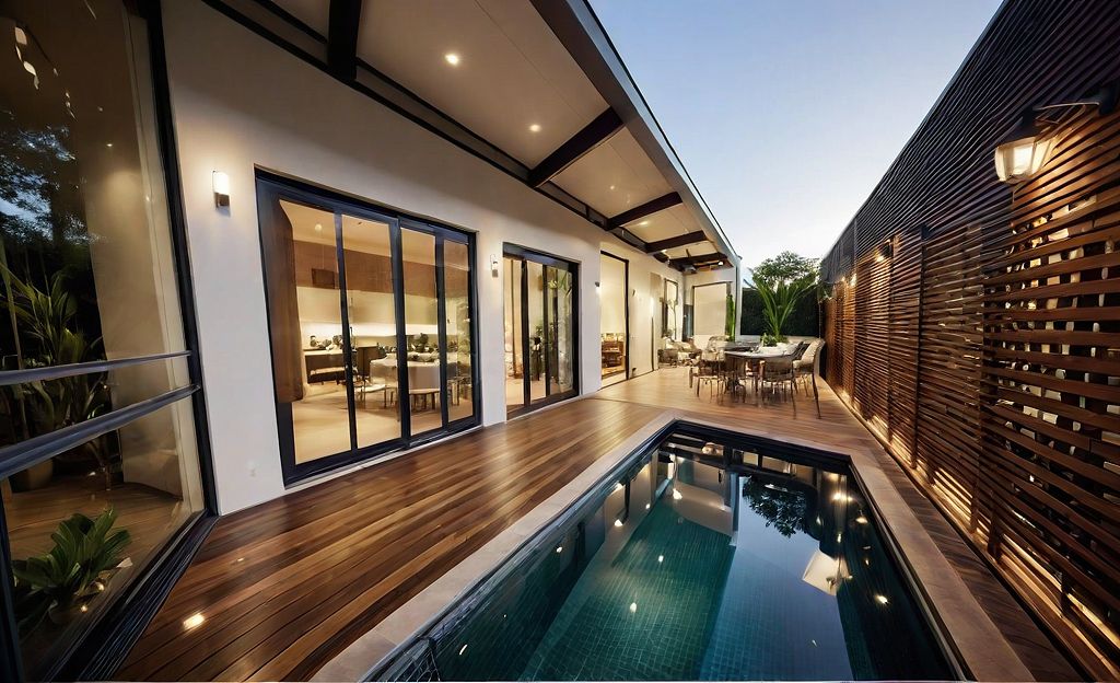PromptPhoto of a modern residential patio, featuring sleek architectural lines and large glass sliding doors that lead indoors. The materials consist of smooth white walls, wooden decking. The setting includes a serene swimming pool reflecting light, surrounded by outdoor seating and soft landscape elements. Natural sunlight brightens the scene, creating gentle shadows and highlights. Captured from a low angle to emphasize depth, with a wide-angle lens to enhance the spacious feeling and capture the full atmosphere of relaxation and contemporary design.