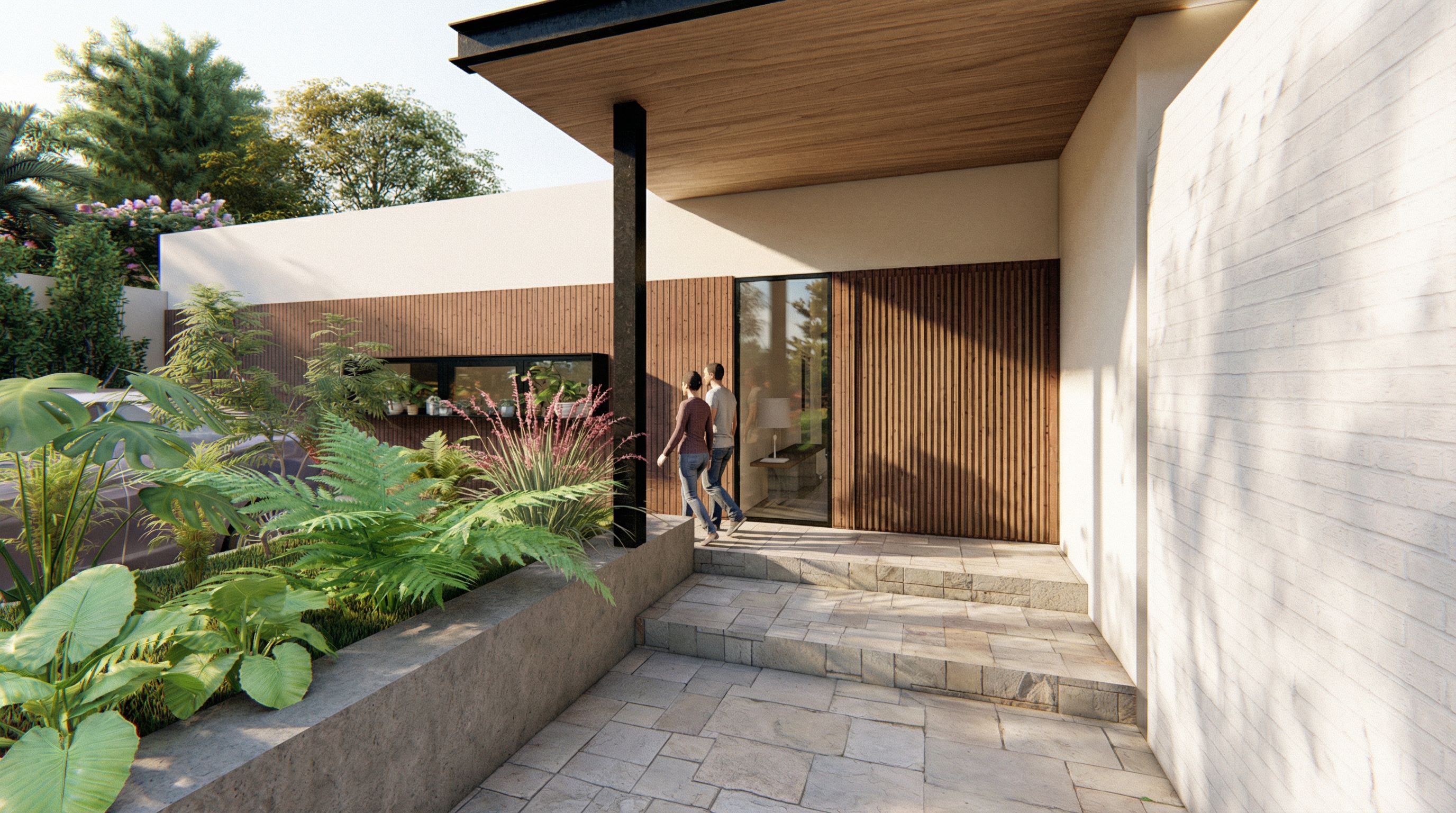 PromptPhoto of a modern residential entryway, featuring sleek wooden accents and large glass doors. The design emphasizes natural materials such as wood and stone, complemented by lush greenery in a concrete planter. Captured in soft morning light, highlighting textures and creating gentle shadows. Angle focused on the stairway leading to the entrance, framed with a slight upward perspective, using a wide-angle lens to encapsulate surrounding landscaping and structure details.