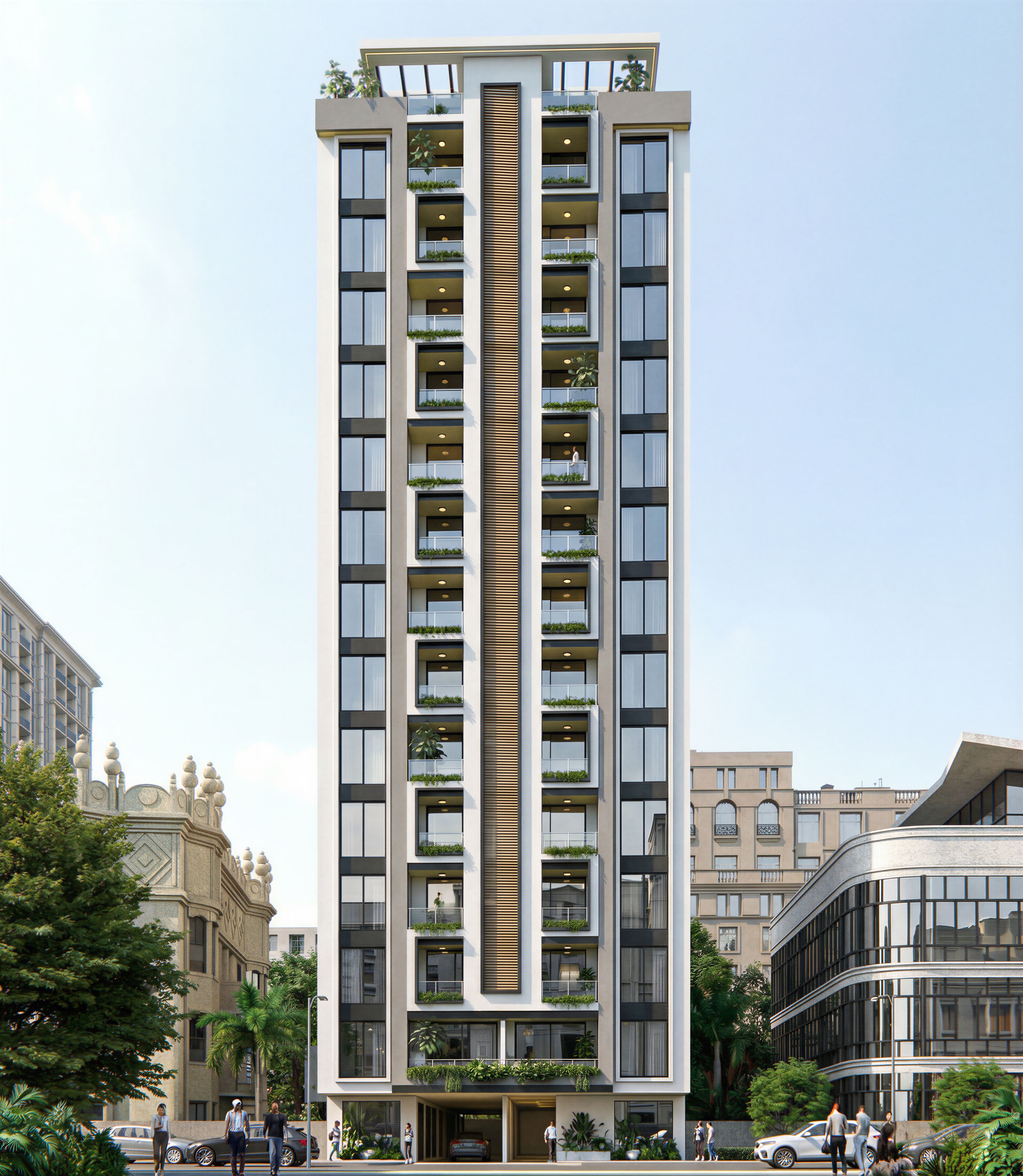 EnhancedPromptPhoto of a modern residential high-rise building, featuring sleek glass facades and defined horizontal lines. Architectural details include balconies with planters and an elegant entrance. Set in an urban environment surrounded by historical and contemporary structures, with lush greenery at the foreground. Soft evening light casts gentle shadows across the facade, enhancing texture contrasts. Captured from a slight low angle, emphasizing height and grandeur, with a wide-angle lens to encompass nearby buildings and vibrant street life. remove car at the entrance, keep exact camera angle