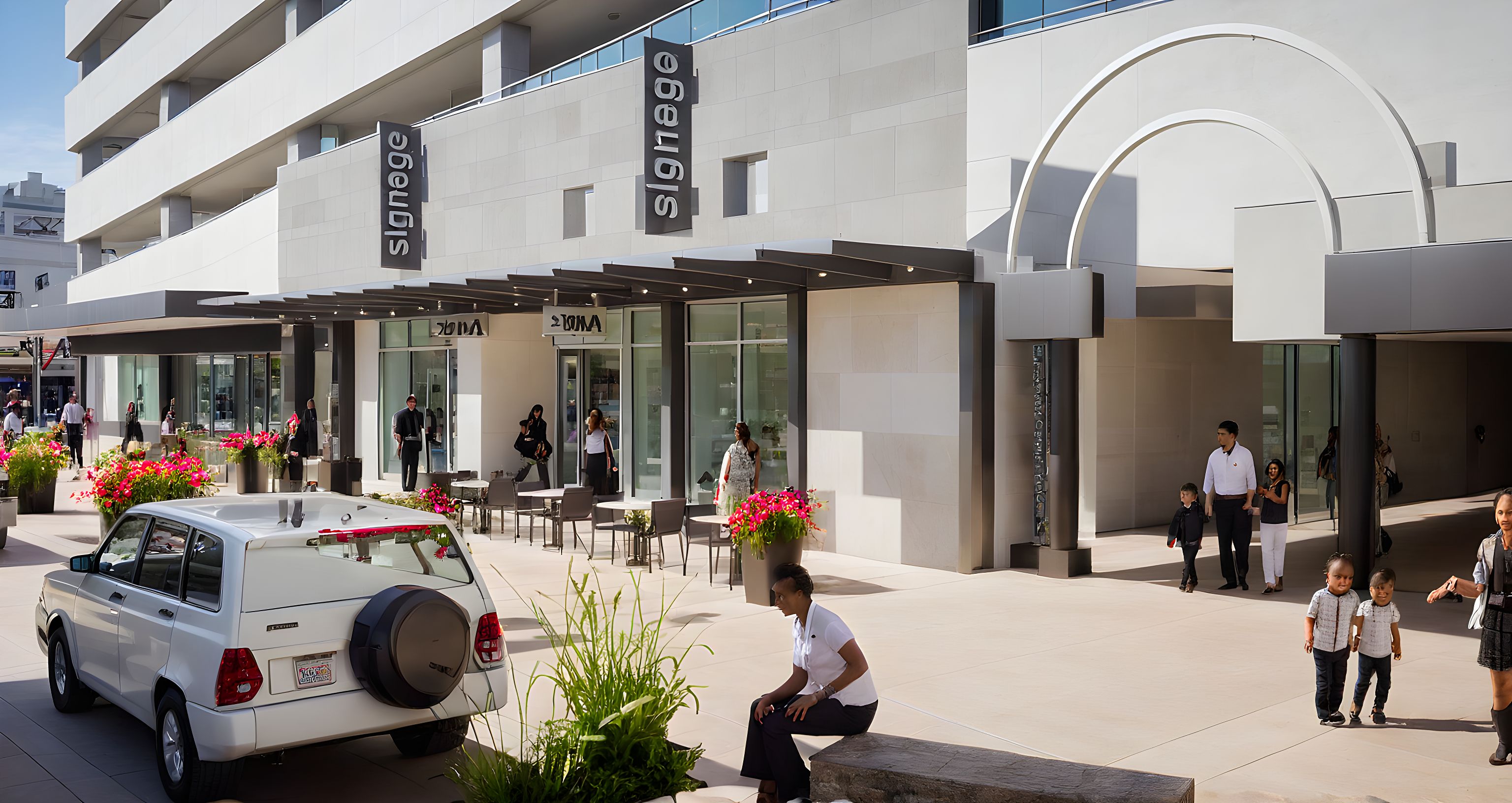 PromptPhoto of a modern parking garage featuring sleek, textured gray and white niches paneling and prominent signage. Urban setting surrounded by vibrant flower planters, bustling pedestrian activity, and nearby shops. Bright natural daylight enhances the architectural details, creating soft shadows and highlights. Captured from a low-angle perspective, focusing on wide sidewalks and storefronts with a 24mm lens to emphasize depth and vibrant street life.