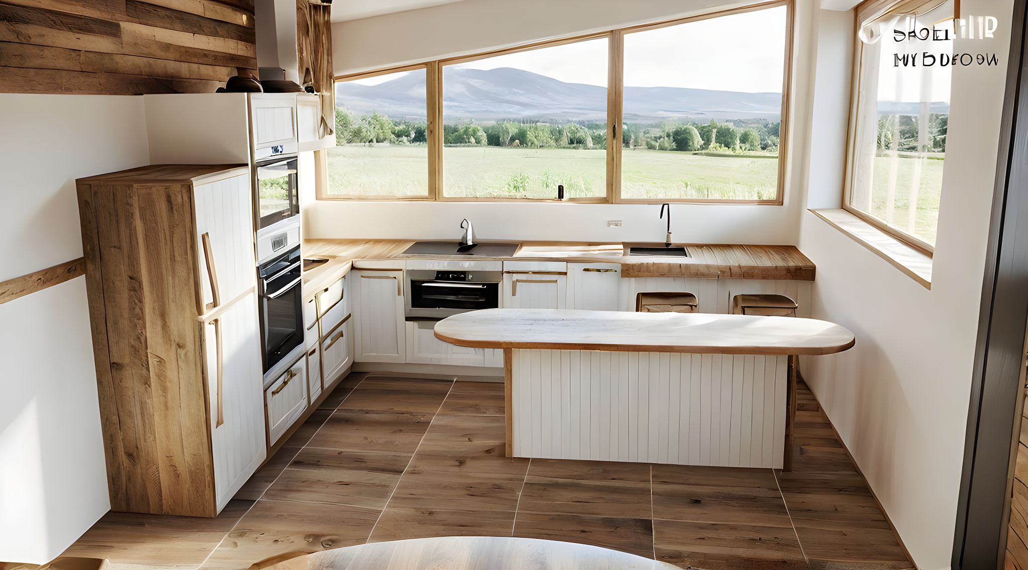 Prompta wodern rustic wood and white only kitchen with slanted window, outside the windows add a field or landscape