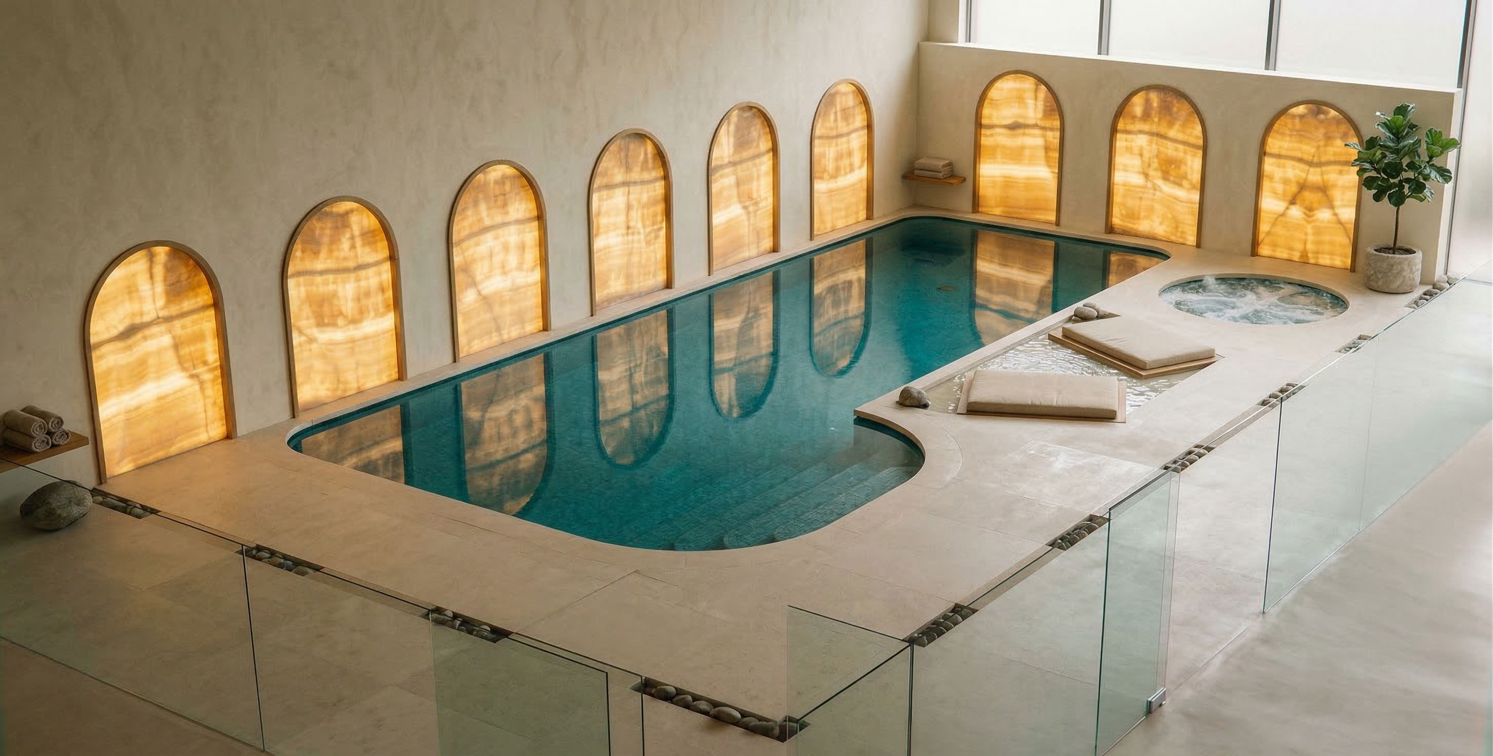PromptCreate a rendering of a wellness area with a swimming pool and jacuzzi. , keep exact camera angle