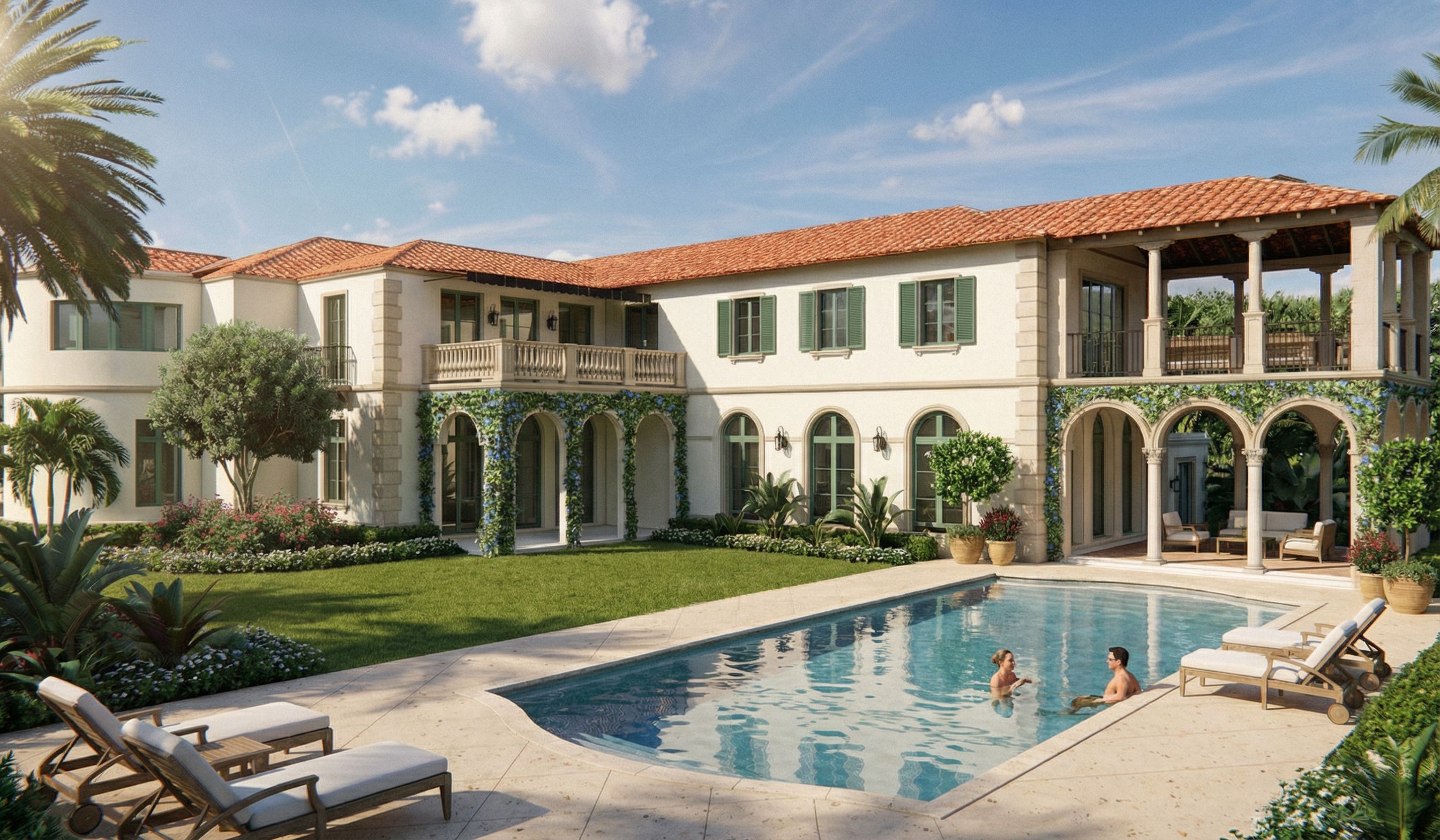 PromptUse the uploaded image as the base reference for the architectural composition and layout. This rendering should correct errors and enhance realism while maintaining the original design intent. ARCHITECTURAL CORRECTIONS (HIGH PRIORITY) Fix any incorrect or unrealistic geometry in the model. All building elements must be physically grounded and structurally believable. Eliminate any floating roof conditions Eliminate any floating or misaligned windows and doors Ensure all openings align properly with floors, walls, and structure Rooflines must connect cleanly and realistically All elements must appear properly supported and constructed Do not redesign the architecture, but correct it to be structurally and visually accurate. LOGGIA + PROPORTION REFINEMENT The loggia should feel heavier, more grounded, and Tuscan in character. Increase the perceived structural weight of the columns End columns should not feel thin — adjust proportions so they appear capable of supporting the structure Slightly thicken column diameters and corner conditions where needed Maintain the same layout and spacing, but refine proportions for realism The loggia should feel solid, classical, and load-bearing, not light or delicate. WINDOWS, DOORS, AND COLOR All windows, doors, and shutters should be painted: Benjamin Moore Essex Green. rich dark in tone. Deep, rich green with a slightly satin finish. Ensure consistency across all openings. Do not add or remove windows or doors — only correct alignment and material quality. POOL + HOT TUB CORRECTION The pool is a refined, luxury swimming pool Clearly define edges, material transitions, and depth differences HARDSCAPE All hardscape should match the front of the house. Use consistent stone material (limestone or shellstone) Add subtle variation, joint lines, and natural wear Surfaces should feel high-end, realistic, and cohesive LANDSCAPING (ULTRA LUXURY PALM BEACH) Landscape should be elevated significantly to feel like a Palm Beach luxury estate / The Breakers lifestyle. You may redesign planting within the general zones, but respect the overall layout and spatial logic. Create a lush, curated, high-end garden with: Layered tropical planting Sculptural palms and specimen trees Refined hedges and structured greenery Flowering accents in controlled tones Rich groundcover and soft transitions The landscaping should feel: intentional mature luxurious immersive Not sparse, not generic, not repetitive. STYLE + ATMOSPHERE This should feel like a luxury lifestyle render, similar to high-end Palm Beach real estate or The Breakers. afternoon light. faces of building should be well lit. should look like a sunny backyatrd. slightly golden but should be bright overall Soft atmospheric haze Slight coastal humidity Rich shadows and depth Inviting, livable atmosphere CAMERA + COMPOSITION Keep a similar perspective but enhance composition to feel more cinematic and editorial. The image should highlight: indoor-outdoor living the loggia the pool and landscape the connection between architecture and garden FINAL QUALITY Ultra photorealistic, high-end architectural visualization. The final image should look like a real photograph of a multimillion dollar Palm Beach estate. DO NOT Do not change the overall layout or massing Do not add or remove windows or doors Do not distort proportions beyond realistic correction Do not create unrealistic or stylized elements Only correct, refine, and elevate. lifestyle: maybe add some polol furniture or people sitting in the pool , keep exact camera angle